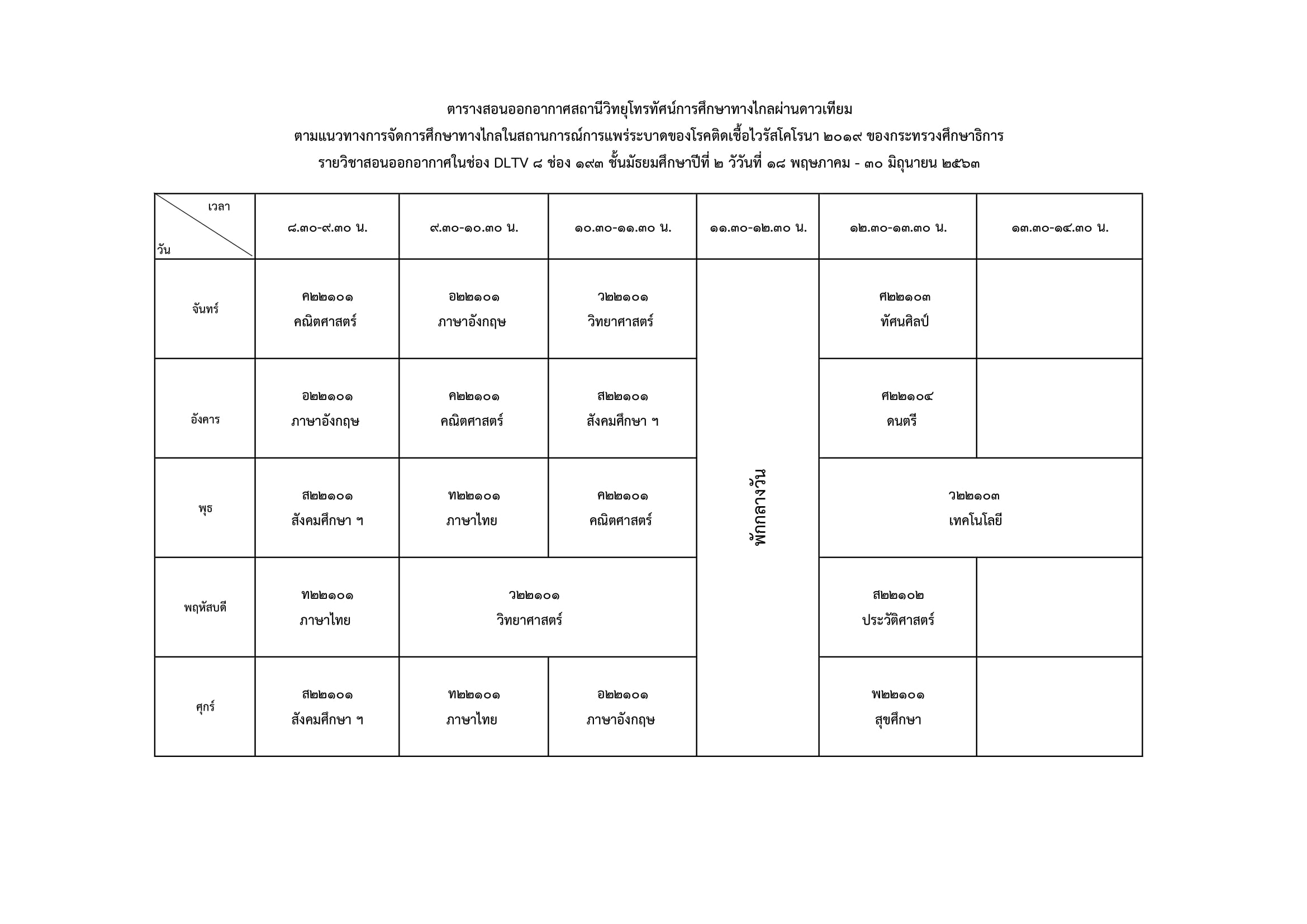 ม.2 สอนผ่านช่อง DLTV 8 ทีวิจิทัลช่อง 47 ทีวีดาวเทียม KU-Band (จานทึบ) ช่อง 193 ทีวีดาวเทียม C-Band (จานโปร่ง) ช่อง 347