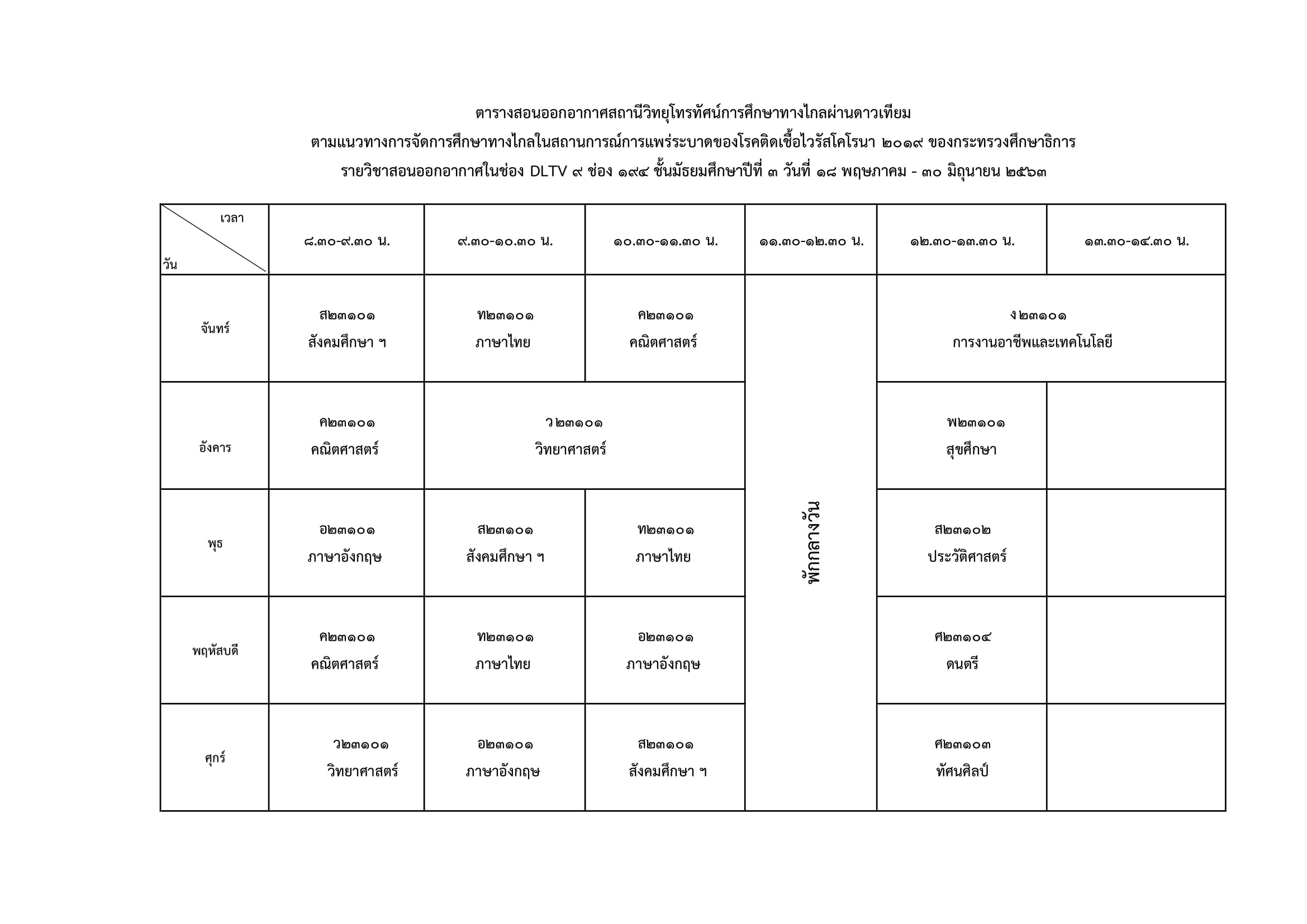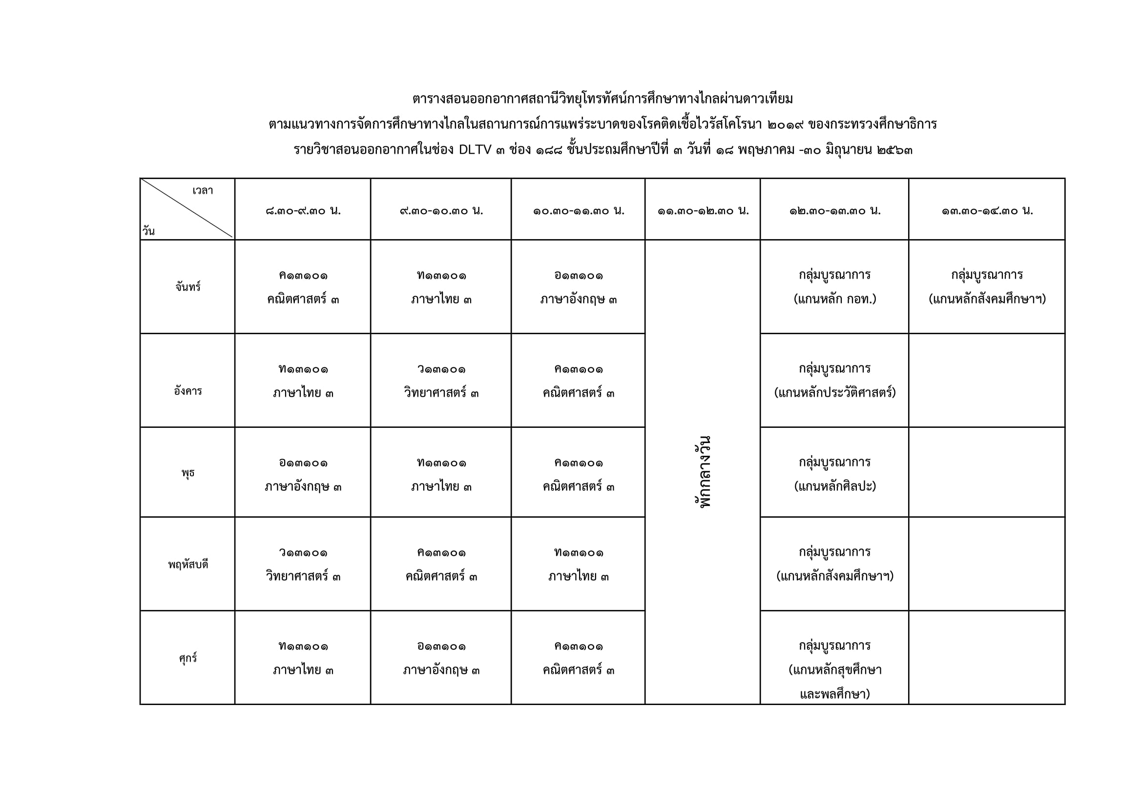 ม.3 สอนผ่านช่อง DLTV 9 ทีวิจิทัลช่อง 48 ทีวีดาวเทียม KU-Band (จานทึบ) ช่อง 194 ทีวีดาวเทียม C-Band (จานโปร่ง) ช่อง 348