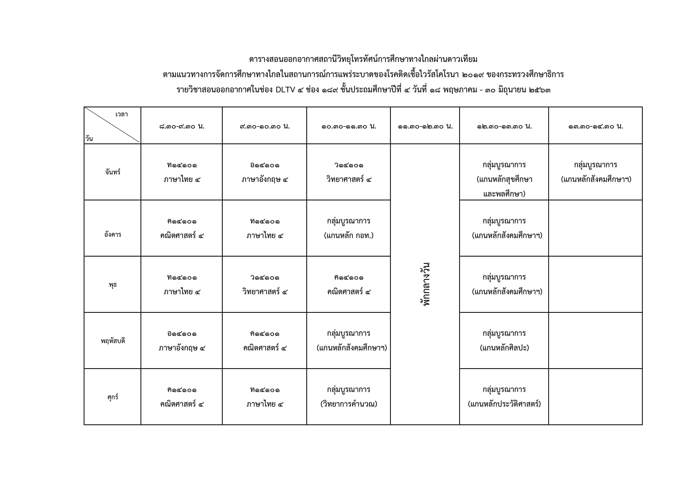 ป.4 สอนผ่านช่อง DLTV 4 ทีวิจิทัลช่อง 43 ทีวีดาวเทียม KU-Band (จานทึบ) ช่อง 189 ทีวีดาวเทียม C-Band (จานโปร่ง) ช่อง 343