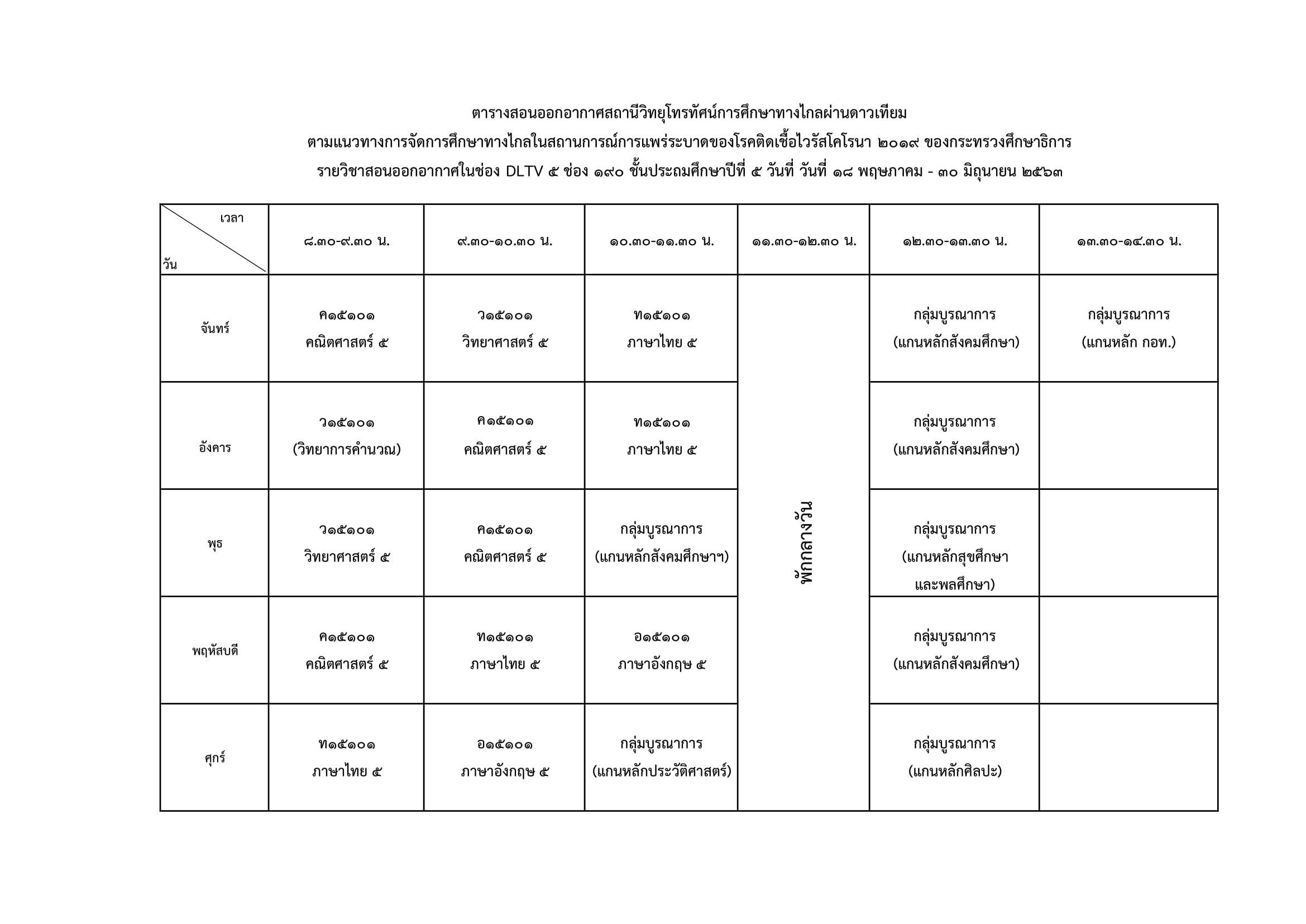 ป.5 สอนผ่านช่อง DLTV 5 ทีวิจิทัลช่อง 44 ทีวีดาวเทียม KU-Band (จานทึบ) ช่อง 190 ทีวีดาวเทียม C-Band (จานโปร่ง) ช่อง 344