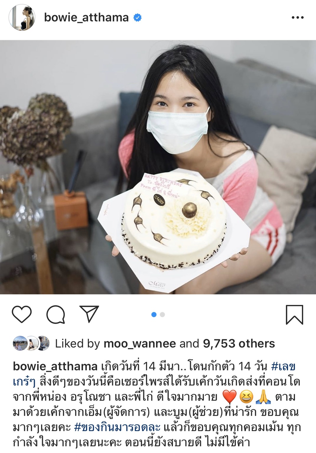 ล่าสุดวันที่ 14 มี.ค. สาว โบวี่ โพสต์ไอจีเป็นรูปตัวเองถือเค้กก้อนโต พร้อมข้อความ “เกิดวันที่ 14 มีนา..โดนกักตัว 14 วัน #เลขเกร๋ๆ สิ่งดีๆ ของวันนี้คือเซอร์ไพรส์ได้รับเค้กวันเกิดส่งที่คอนโด จากพี่หน่อง อรุโณชา และพี่ไก่ ดีใจมากมาย ตามมาด้วยเค้กจากเอ็ม (ผู้จัดการ) และบูม (ผู้ช่วย) ที่น่ารัก ขอบคุณมากๆ เลยคะ #ของกินมารอดละ แล้วก็ขอบคุณทุกคอมเมนต์ ทุกกำลังใจมากๆ เลยนะคะ ตอนนี้ยังสบายดี ไม่มีไข้ค่า”