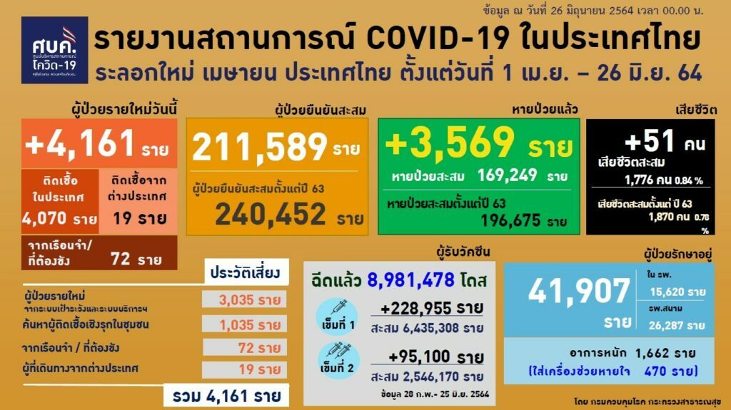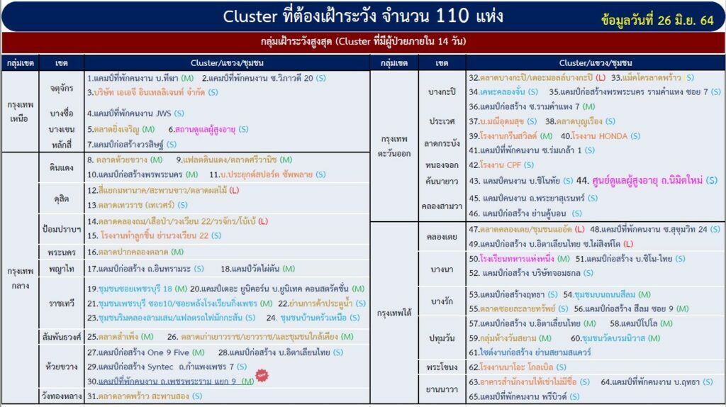 เมื่อวันที่ 26 มิ.ย.64 ผู้สื่อข่าวรายงานว่า ศูนย์บริหารสถานการณ์การแพร่ระบาดของโรคติดเชื้อไวรัสโคโรนา 2019 (โควิด-19) (ศบค.) รายงานสถานการณ์การแพร่ระบาดของ โควิด-19 ในประเทศไทย ว่า คลัสเตอร์ที่ต้องเฝ้าระวังจำนวน 110 แห่ง แบ่งเป็นกลุ่มเฝ้าระวังสูงสุดที่มีผู้ติดเชื้อภายใน 14 วัน ประกอบด้วย กลุ่มเขตกรุงเทพเหนือ เขตจตุจักร : แคมป์ที่พักคนงาน บริษัททีฆา, แคมป์ที่พักคนงาน ซอยวิภาวดี 20, บริษัทเอเอจี อินเทลลิเจนท์ จำกัด เขตบางซื่อ : แคมป์ที่พักคนงาน JWS เขตบางเขน : ตลาดยิ่งเจริญ และสถานดูแลผู้สูงอายุ และเขตหลักสี่ : แคมป์ก่อสร้างวรสิษฐ์
