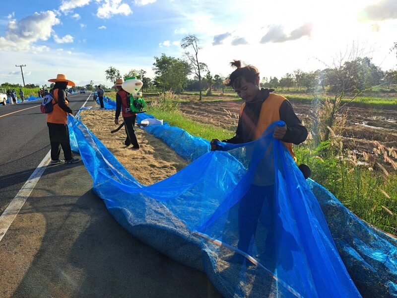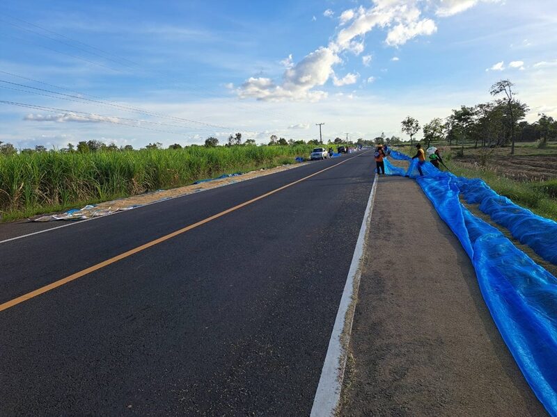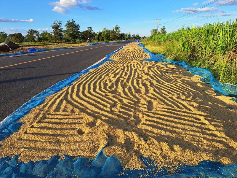 ชาวนาบุรีรัมย์ ขอความเห็นใจ ต้องตากข้าวบนถนน ยาว 1 กม. เกี่ยวข้าวสดไปขาย โดนโรงสีกดราคา วอนรัฐบาลประกันราคาข้าว 15–18 บาท