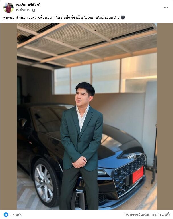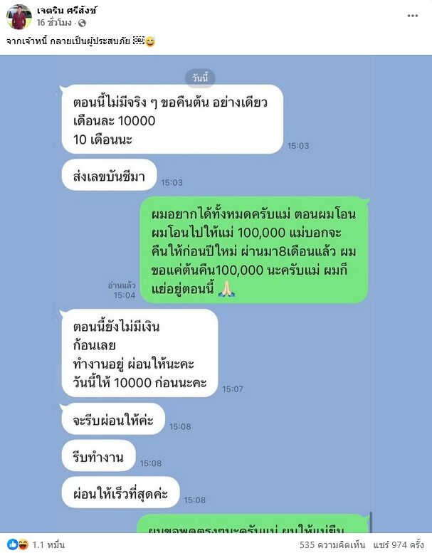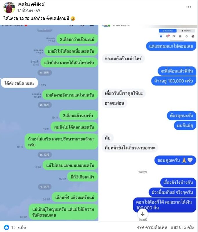 “เราคุยกันว่าไม่เกินปีใหม่ที่จะคืน แต่แล้ว ผ่านมาเดือน8แล้ว ผมทักไปไม่มีคำตอบ ผมเลือกที่จะโพสต์เพื่อที่ว่า ผมอยากได้ตรงนี้คืน เพราะผมก็แย่อยู่ คุยกันสรุปง่ายๆ คือ วันที่ 20 ผมขอ 30,000 วันที่ 30 ผมขอ 30,000 และเดือนหน้าก่อนวันที่ 12 ผมของ 40,000 ทั้งหมด 3 งวด รอดูว่าผมจะได้มั้ย ผมบอกตามตรงผมก็แย่อยู่ ถ้าไม่แย่ผมไม่โพสต์ ผมแย่แม้กระทั่งผมขายรถออดี้ ที่ไม่อยากขาย แต่มันจำเป็นต้องขาย”