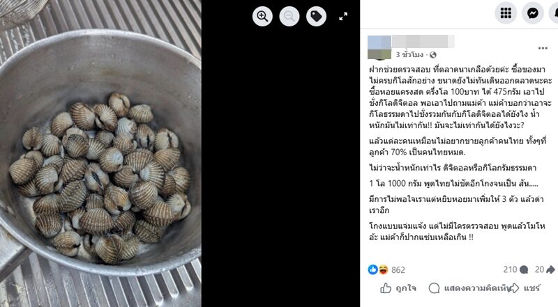 วันที่ 23 ต.ค.68 ได้มีผู้ใช้เฟซบุ๊กรายหนึ่ง โพสต์ลงในกลุ่ม "พวกเราคือผู้บริโภค" หลังไปซื้อหอยที่ตลาดนาเกลือ แต่พอเอาไปชั่งกิโลดิจิตอลกลับพบว่า น้ำหนักหอยหายไป 25 กรัม โดยระบุว่า