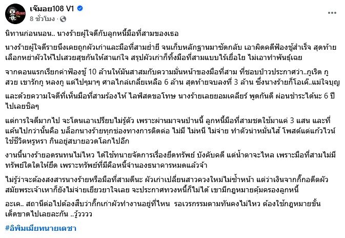 วงการบันเทิงไม่ต้องพักเพจ เจ๊มอย108 V1 โพสต์นิทานอีกเรื่องว่า “นิทานก่อนนอน.. นางร้ายผู้ใจดีกับลูกหนี้มือที่สามของเธอ นางร้ายผู้ใจดีรายนึงเคยถูกผัวเก่าและมือที่สามย่ำยี จนเก็บหลักฐานมาซัดกลับ เอาผิดคดีฟ้องชู้สำเร็จ สุดท้ายเลือกหย่าผัวให้ไปเสวยสุขกันให้สาแก่ใจ สรุปผัวเก่าก็ทิ้งมือที่สามแบบไร้เยื่อใย ไม่เอาทำพันธุ์เฉย”