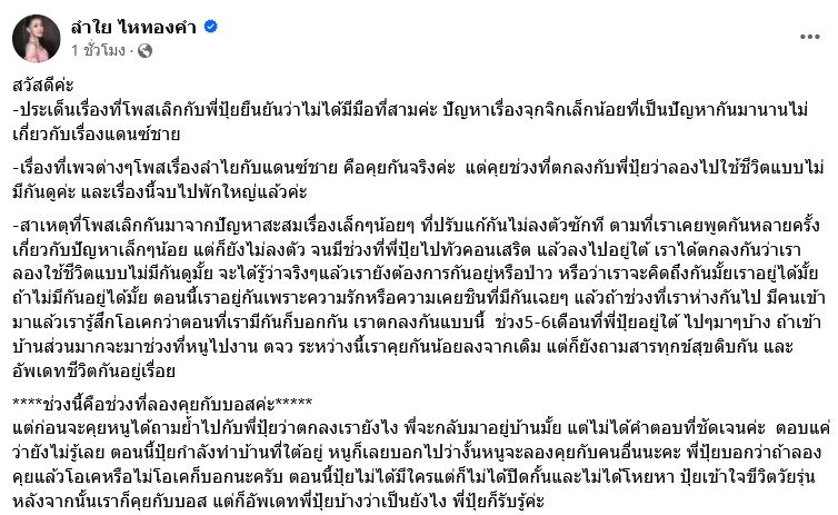 -เรื่องที่เพจต่างๆโพสเรื่องลำไยกับแดนซ์ชาย คือคุยกันจริงค่ะ แต่คุยช่วงที่ตกลงกับพี่ปุ้ยว่าลองไปใช้ชีวิตแบบไม่มีกันดูค่ะ และเรื่องนี้จบไปพักใหญ่แล้วค่ะ”
