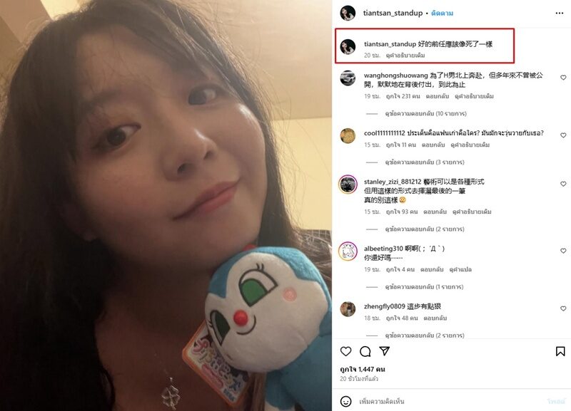 โดยพบว่าหลังเสียชีวิต เทียนฉาน ได้อัพเดตอินสตาแกรมขึ้นมาทันที คาดว่าตั้งเวลาเผยแพร่ไว้ล่วงหน้า โดยเขียนข้อความว่า “แฟนเก่าที่ดีควรจะเหมือนคนที่ตายไปแล้ว” ท่ามกลางคอมเมนต์จากแฟนๆเข้ามาร่วมอาลัยสุดเศร้า พร้อมทั้งวิพากษ์วิจารณ์ถึงแฟนหนุ่มแฟนเก่าของเทียนฉานคือใคร