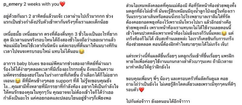 “อาการ Baby Blue ของแม่พีกมากช่วงสองอาทิตย์ที่ผ่านมา ร้องไห้ได้ง่ายๆ ตลอดเวลาที่มีเรื่องอะไรกระตุ้น ถึงจะเป็นความมหัศจรรย์ของฮอร์โมนในร่างกายที่เกิดขึ้น ถ้าเลือกได้ก็ไม่อยากเจอนะ ดีที่มีคนข้างๆ คอย support ที่ดี ไม่รู้จะขอบคุณยังไง คุณสามีทั้งหลายที่มีภรรยาที่กำลังท้อง อยากให้เป็นกำลังใจให้คนรักของคุณในทุกๆ วัน คุณอาจจะไม่ต้องเข้าใจก็ได้ว่าเธอกำลังเป็นอะไร แค่คอยกอดและปลอบโยนอยู่ข้างๆ ก็เพียงพอ”