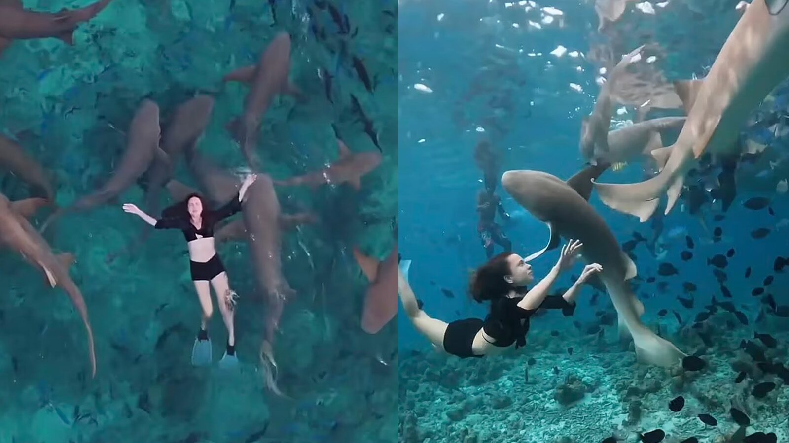 อินฟลูเอนเซอร์สาวเที่ยวมัลดีฟส์ ถ่ายรูปคู่ฝูงฉลาม ได้ภาพสวยแต่อันตราย โดนงับมือเลือดซิบ