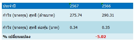 สำหรับผลประกอบการในปี 67 บริษัทและบริษัทย่อยมีกำไรสุทธิเป็นจำนวน 275.7 ล้านบาท ลดลงเท่ากับ 14.6 ล้านบาท หรือลดลงคิดเป็นร้อยละ 5.0 เมื่อเปรียบเทือบกับกับกำไรสุทธิของปีที่ผ่านมา โดยมีสาเหตุหลักจากการลดลงของรายได้จากการบริการค้านการบริหารข้อมูล และความเสียง เป็นจำนวน 65.0 ล้านบาท