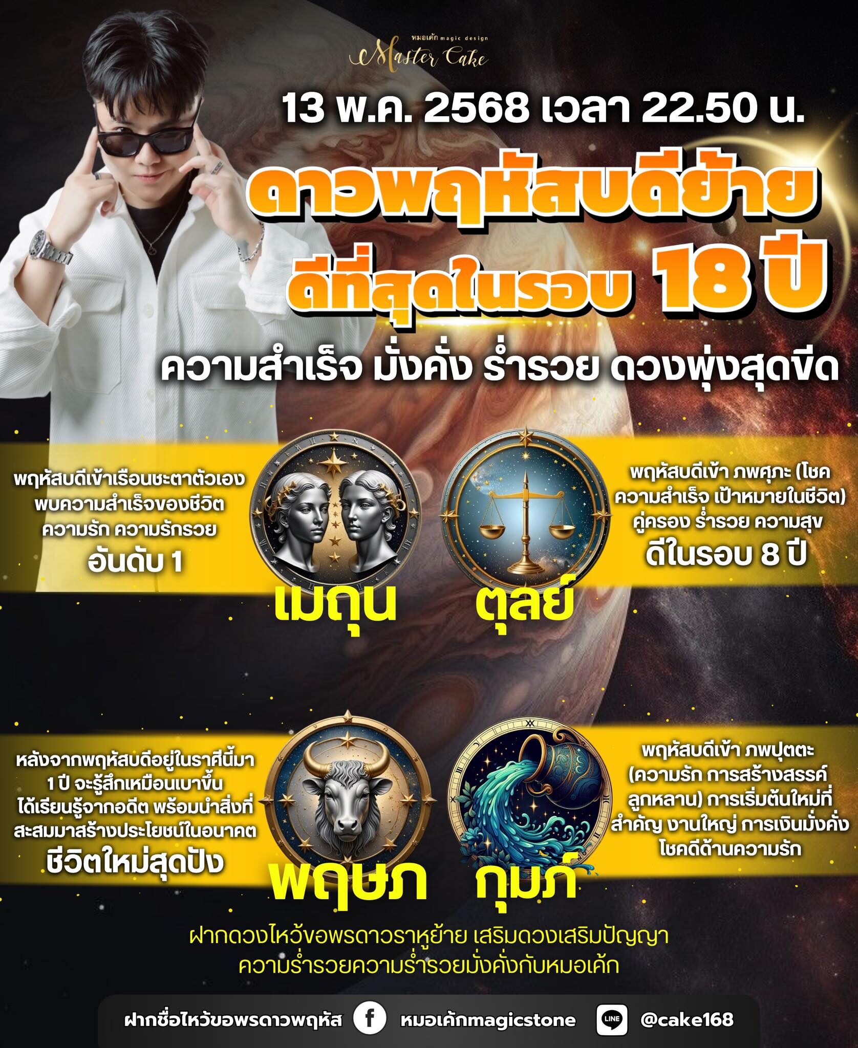 หมอเค้ก Magic stone เผยถึงดวงราศี 13 พ.ค.2568 เวลา 22.50 น. ดาวพฤหัสบดีย้าย ดีที่สุดในรอบ 18 ปี ความสำเร็จ มั่งคั่ง ร่ำรวย ดวงพุ่งสุดขีด พฤหัสบดีเข้าเรือนชะตาตัวเอง พบความสำเร็จของชีวิต ความรัก ความรวยอันดับ 1 พฤหัสบดีเข้าภพศุภะ (โชคความสำเร็จ เป้าหมายในชีวิต) คู่ครอง ร่ำรวย ความสุข ดีในรอบ 8 ปี