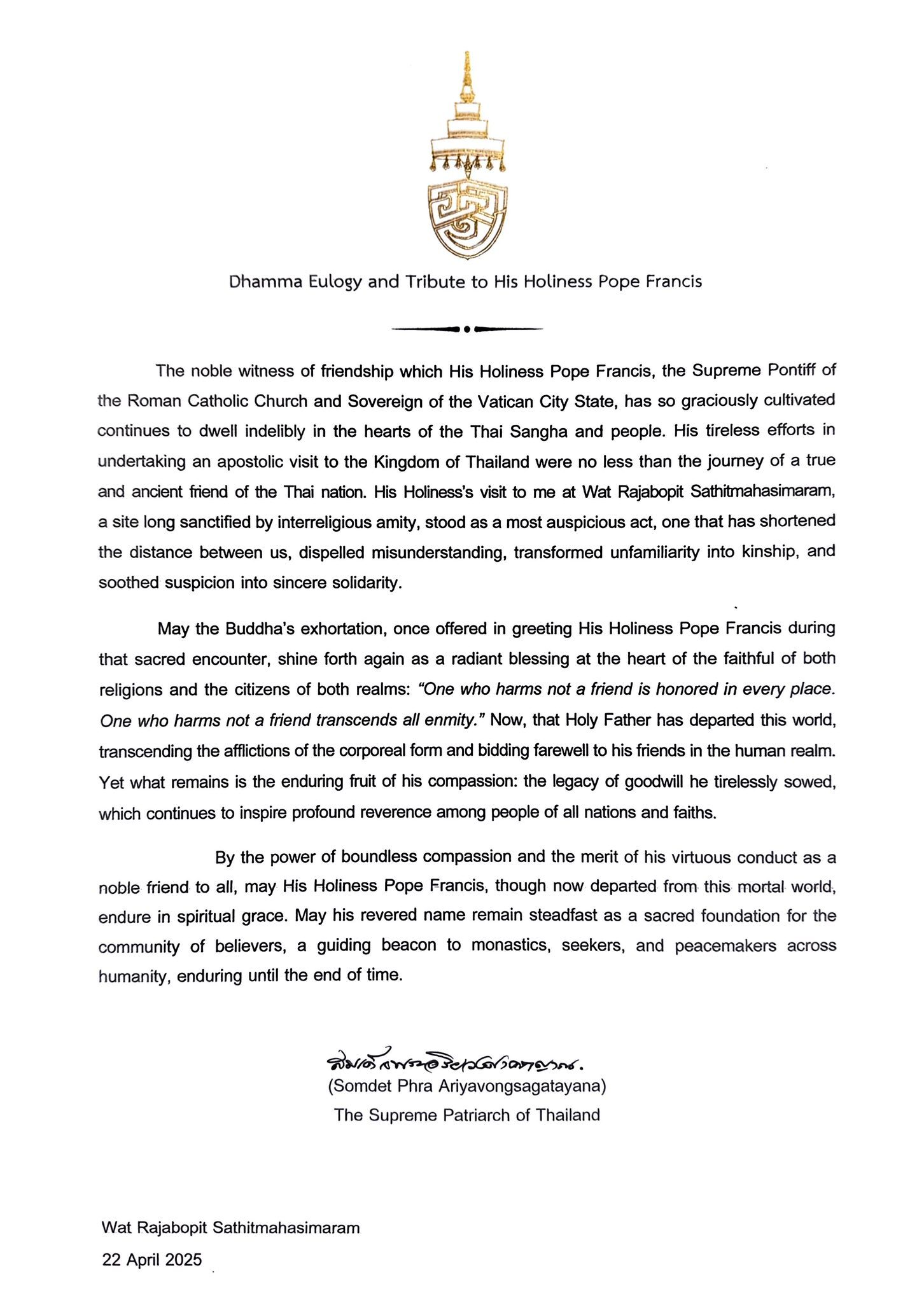 ขออัญเชิญพระพุทธานุศาสนี ที่เคยถวายพระพรรับเสด็จสมเด็จพระสันตะปาปาฟรังซิสไว้แต่หนนั้นให้รุ่งโรจน์เป็นสิริอยู่กลางใจของศาสนิกชนทั้งสองศาสนา และของประชากรทั้งสองอาณาจักรอีกคำรบว่า "ผู้ไม่ประทุษร้ายมิตร ย่อมมีผู้บูชาในที่ทั้งปวง. ผู้ไม่ประทุษร้ายมิตร ย่อมผ่านพ้นศัตรูทั้งปวง."