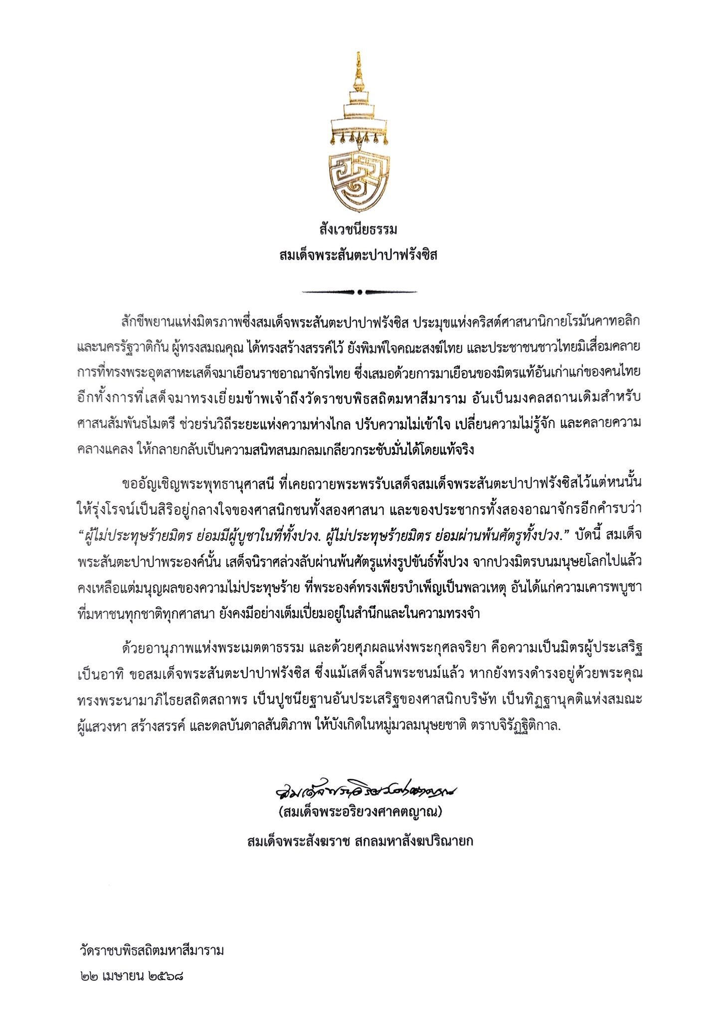 วันที่ 22 เม.ย. 2568 สมเด็จพระอริยวงศาคตญาณ สมเด็จพระสังฆราช สกลมหาสังฆปริณายก โปรดมีพระสังเวชนียธรรม การสิ้นพระชนม์ของสมเด็จพระสันตะปาปาฟรานซิส