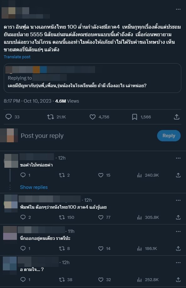 ชายคนนี้เล่าว่า"ดารา อินฟูล นางเอกหนังไทย 100 ล้านกำลังจะมีภาค 4 เหม็นกูทุกเรื่องตั้งแต่ประถมยันม.ปลาย 5555 นิสัยแย่นะแต่สังคมชอบคนแบบนี้เค้าถึงดัง เมื่อก่อนพยายามแบบปล่อยวางไม่โกรธ ตอนนี้เออทำไมต้องให้อภัยถ้าไม่ได้รับคำขอโทษบ้าง เห็นขายสตอรี่นิสัยแย่ ๆ แล้วดัง"