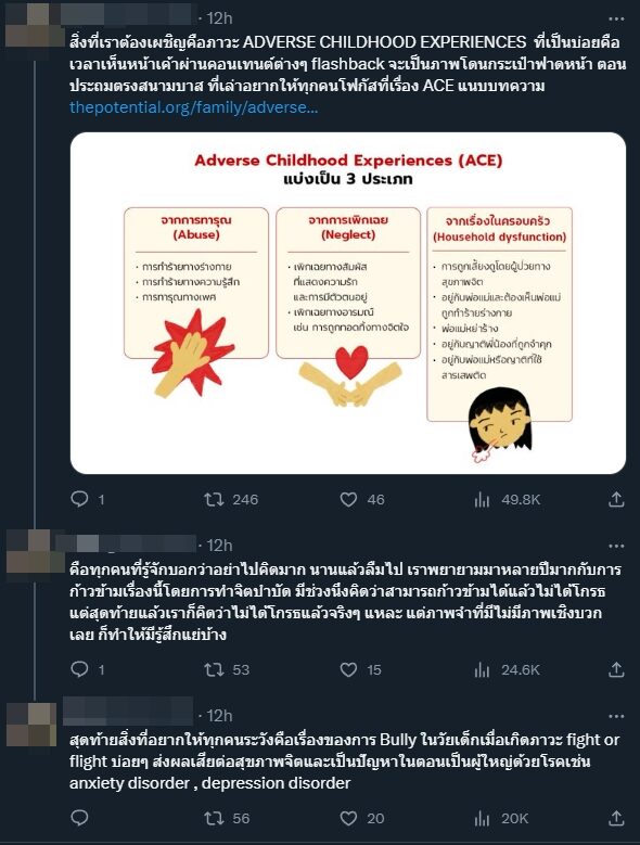 "สิ่งที่เราต้องเผชิญคือภาวะ ADVERSE CHILDHOOD EXPERIENCES ที่เป็นบ่อยคือเวลาเห็นหน้าเขาผ่านคอนเทนต์ต่าง ๆ flashback จะเป็นภาพโดนกระเป๋าฟาดหน้า ตอนประถมตรงสนามบาส"