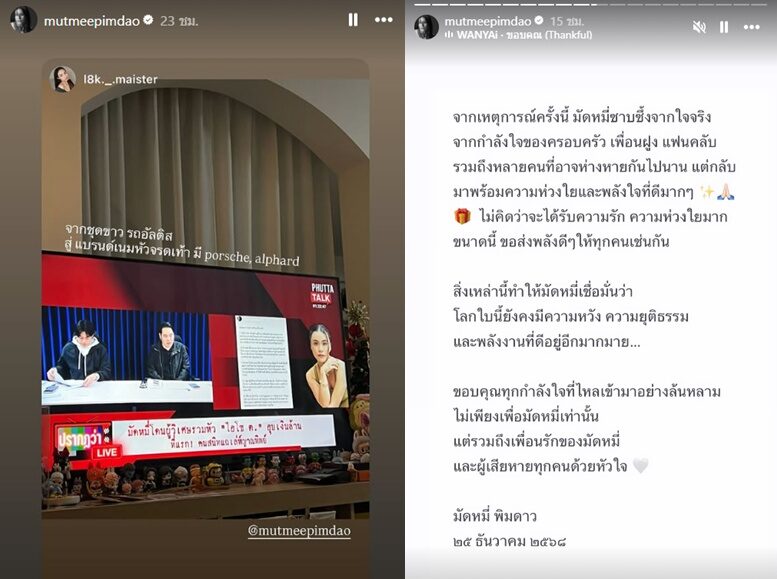 ขณะที่ สาวมัดหมี่ ก็โพสต์ล่าสุดขอบคุณทุกกำลังใจล้นหลาม หลังเจ้าตัวออกมาเล่าอุทาหรณ์ครั้งนี้ด้วย เป็นกำลังใจให้ตัวเองและเพื่อนรักของเจ้าตัว รวมทั้งผู้เสียหายทุกคนด้วย