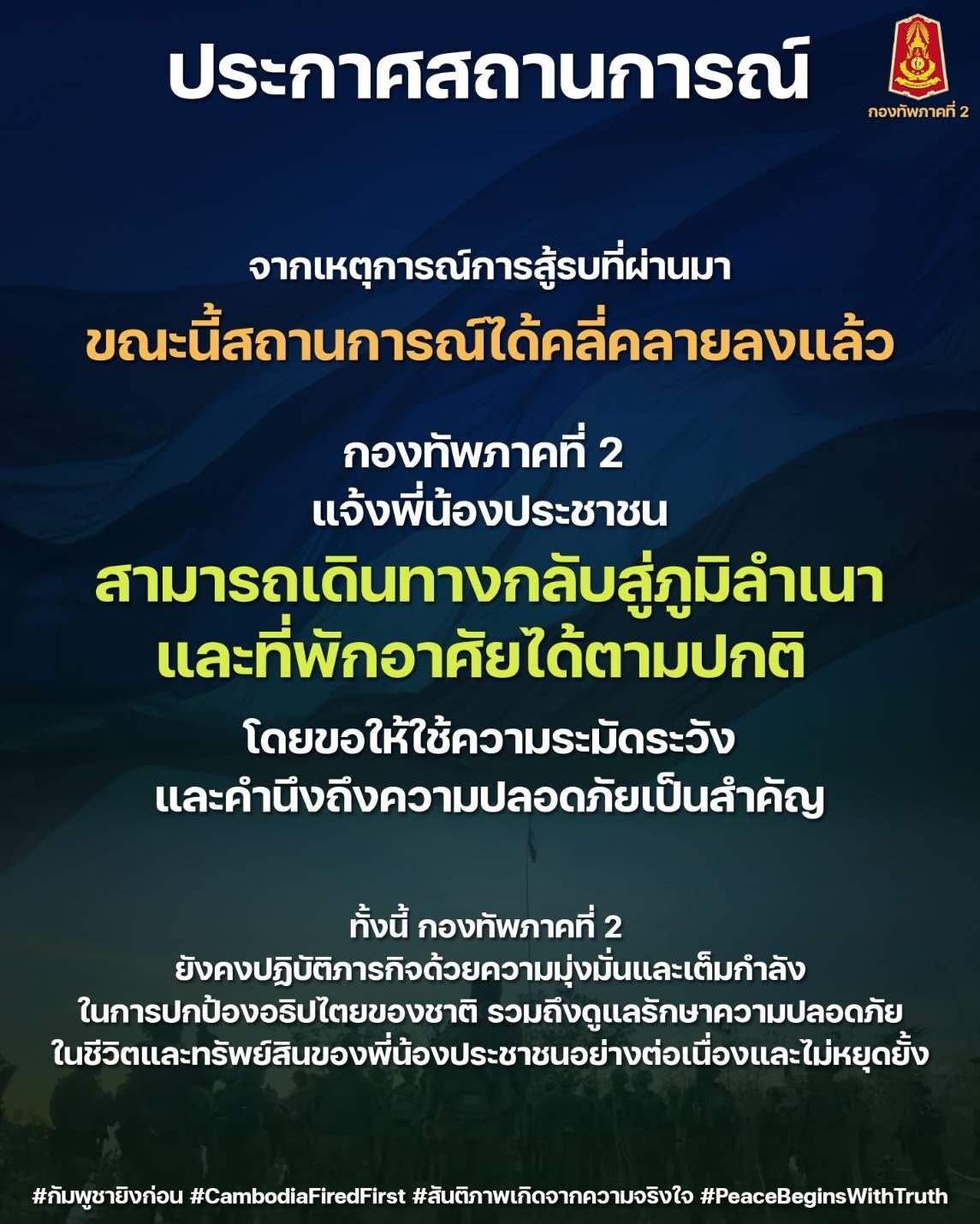 กองทัพภาคที่ 2 ประกาศสถานการณ์ แจ้งพี่น้องประชาชนสามารถเดินทางกลับสู่ภูมิลำเนา และที่พักอาศัยได้ตามปกติ