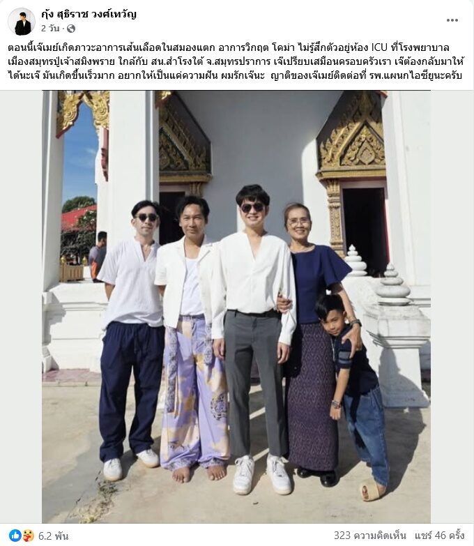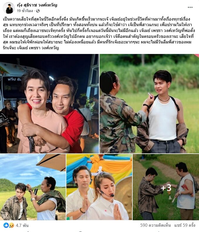 เจอความสูญเสียใหญ่หลายต่อหลายครั้งพระเอกลิเกดัง กุ้ง สุธิราช วงศ์เทวัญ สูญเสียนางเอกลิเกดังวิรดา น้องสาวก็โศกเศร้ามาหนักแล้ว ต้องมาพบความสูญเสียอีก โดยเจ้าตัวเพิ่งโพสต์เมื่อสองวันถึงอาการป่วย เจ๊เมย์ เพชรา วงศ์เทวัญ ช่างแต่งหน้าที่ผูกพันกันมากเหมือนคนในครอบครัววงศ์เทวัญว่า “ตอนนี้เจ๊เมย์เกิดภาวะอาการเส้นเลือดในสมองแตก อาการวิกฤต โคม่า ไม่รู้สึกตัวอยู่ห้อง ICU ที่โรงพยาบาลเมืองสมุทรปู่เจ้าสมิงพราย ใกล้กับ สน.สำโรงใต้ จ.สมุทรปราการ เจ๊เปรียบเสมือนครอบครัวเรา เจ๊ต้องกลับมาให้ได้นะเจ๊ มันเกิดขึ้นเร็วมาก อยากให้เป็นแค่ความฝัน ผมรักเจ๊นะ ญาติของเจ๊เมย์ติดต่อที่ รพ.แผนกไอซียูนะครับ”