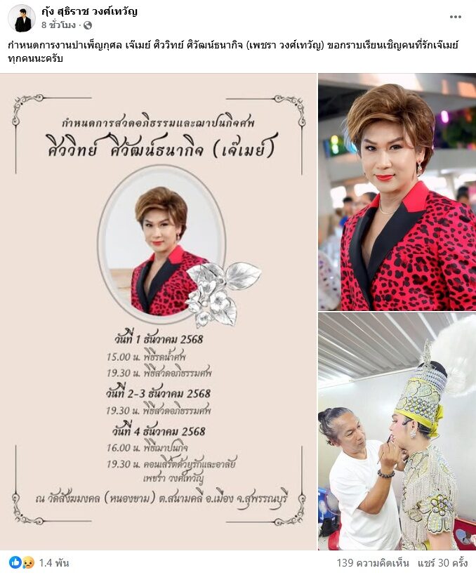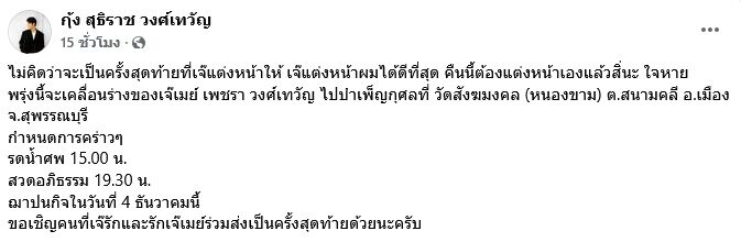 พรุ่งนี้จะเคลื่อนร่างของเจ๊เมย์ เพชรา วงศ์เทวัญ ไปบำเพ็ญกุศลที่ วัดสังฆมงคล (หนองขาม) ต.สนามคลี อ.เมือง จ.สุพรรณบุรี