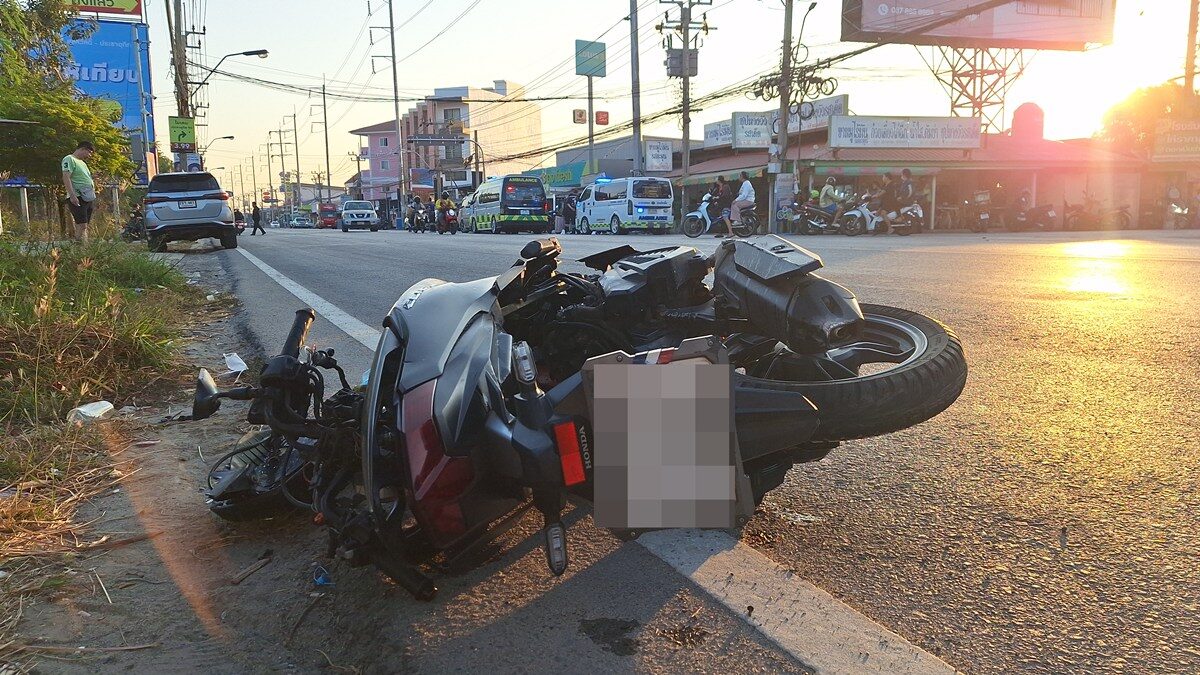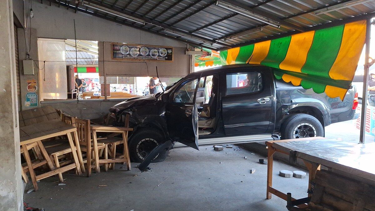 ทำให้พุ่งชนประสานงากับรถจักรยานยนต์อย่างจัง จนร่างคนขี่รถจักรยานยนต์เสียชีวิต ส่วนรถกระบะพุ่งเข้าชนกับร้านขายราดหน้าข้างทางจนพังเสียหาย โชคดีที่ร้านยังไม่เปิดไม่เช่นนั้นอาจจะมีผู้ได้รับบาดเจ็บและเสียชีวิตเพิ่มอีกหลายราย