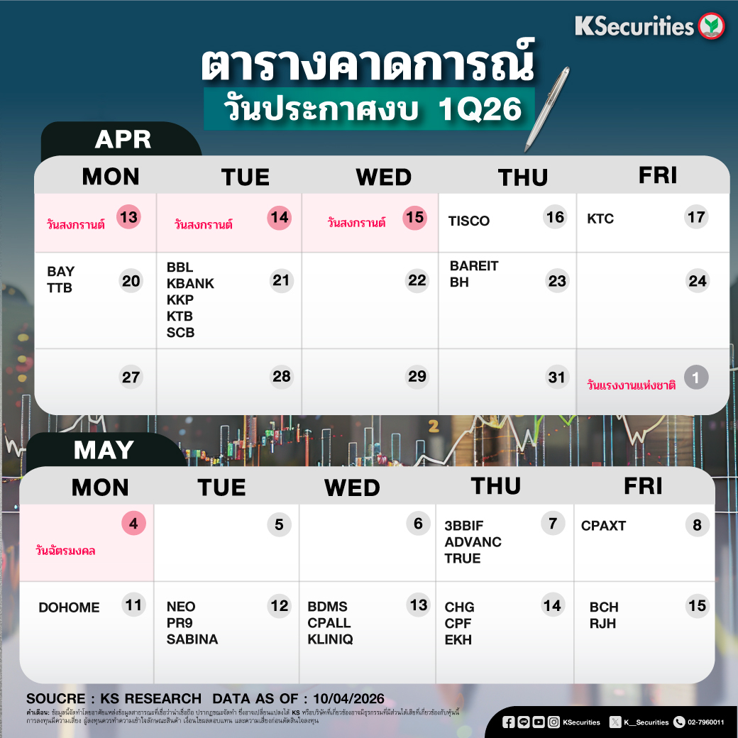 สำหรับตารางคาดการณ์ในเดือนเมษายน 2569 ประเมินว่าจะประเดิมการประกาศผลการดำเนินงานด้วย บริษัท ทิสโก้ไฟแนนเชียลกรุ๊ป จำกัด (มหาชน) หรือ TISCO ในวันที่ 16 เมษายน ตามมาด้วย บริษัท บัตรกรุงไทย จำกัด (มหาชน) หรือ KTC ในวันที่ 17 เมษายน