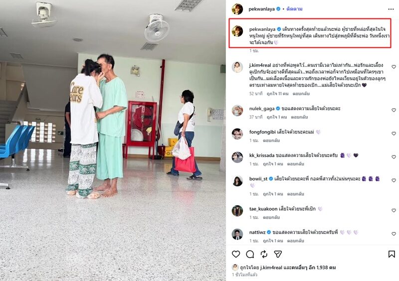 เจนนิเฟอร์ คิ้ม ก็มาคอมเมนต์ให้กำลังใจด้วยว่า “อย่างที่พ่อพูดไว้…คนเรามีเวลาไม่เท่ากัน…พ่อรักและเลี้ยงดูเป๊กกับจ๊ะอย่างดีที่สุดแล้ว…พอถึงเวลาพ่อก็จากไปเหมือนที่ใครๆเขาเป็นกัน…แต่เลือดเนื้อและความรักของพ่อยังไหลเวียนอยู่ในตัวของลูกๆตราบเท่าลมหายใจสุดท้ายของเป๊ก….แม่เสียใจด้วยนะเป๊ก”