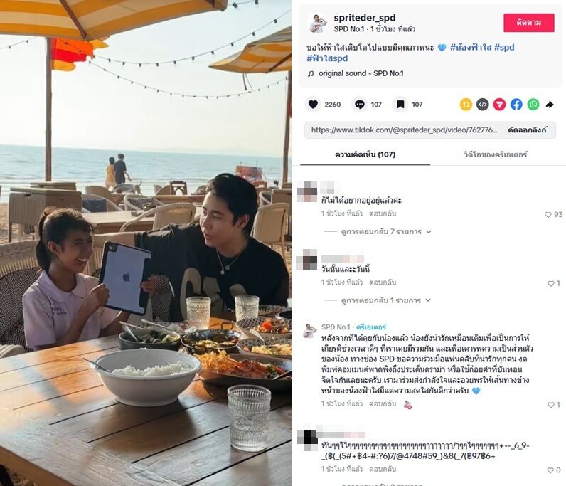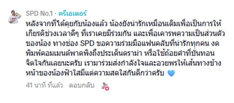 “หลังจากที่ได้คุยกับน้องแล้ว น้องยังน่ารักเหมือนเดิมเพื่อเป็นการให้เกียรติช่วงเวลาดีๆ ที่เราเคยมีร่วมกัน และเพื่อเคารพความเป็นส่วนตัวของน้อง ทางช่อง SPD ขอความร่วมมือแฟนคลับที่น่ารักทุกคน งดพิมพ์คอมเมนต์พาดพิงถึงประเด็นดราม่า หรือใช้ถ้อยคำที่บั่นทอนจิตใจกันเลยนะครับ เรามาร่วมส่งกำลังใจและอวยพรให้เส้นทางข้างหน้าของน้องฟ้าใสมีแต่ความสดใสกันดีกว่าครับ”