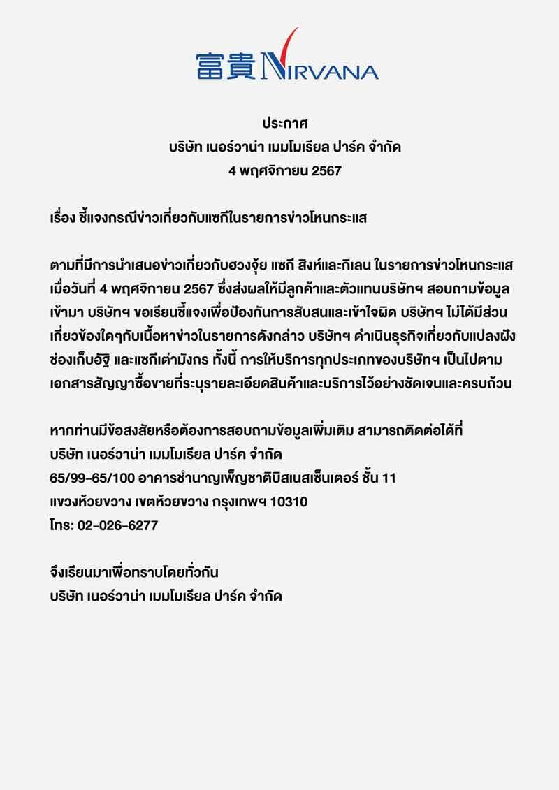 ล่าสุดวันที่ 5 พ.ย.2567 เพจเฟซบุ๊ก สุสานเนอร์วาน่า เมมโมเรียล ปาร์ค บ้านบึง ได้ออกเอกสารชี้แจงว่า ชี้แจงกรณีข่าวเกี่ยวกับแซกีในรายการข่าวโหนกระแส ตามที่มีการนำเสมอข่าวเกี่ยวกับฮวงจุ้ย แซกี สิงห์และกิเลน ในรายการข่าวโหนกระแส เมื่อวันที่ 4 พฤศจิกายน 2567 ซึ่งส่งผลให้มีลูกค้าและตัวแทนบริษัทฯ สอบถามข้อมูล เข้ามา