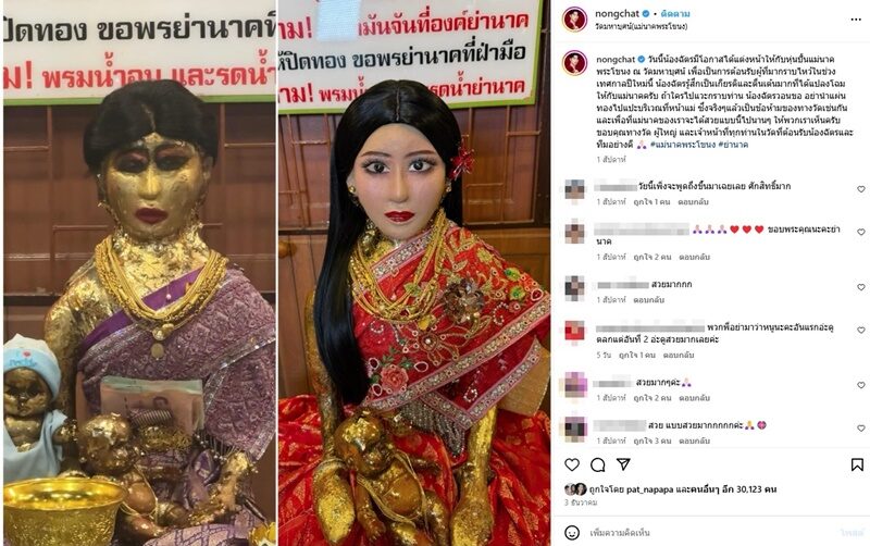 เพิ่งสร้างความฮือฮา น้องฉัตร ช่างแต่งหน้าชื่อดัง แปลงโฉมแต่งหน้าหุ่นปั้น แม่นาคพระโขนง วัดมหาบุศย์ สวยงามต้อนรับผู้ที่มากราบไหว้ในช่วงเทศกาลปีใหม่