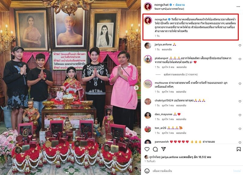 ล่าสุด น้องฉัตร โพสต์ภาพไปหาย่านาคอีกครั้งว่า “วันนี้ย่านาคเหมือนดลจิตดลใจให้น้องฉัตรแวะมาเติมหน้าให้ย่าอีกครั้ง เพราะช่วงนี้ย่านาคมีแขกมาไหว้ขอพรเยอะมากๆ แถมมีคนถูกหวยจากเลขที่ย่านาคให้ด้วย ตัวน้องฉัตรและทีมงานจึงนำเอาเครื่องสำอางมาถวายให้ย่าด้วยครับ”
