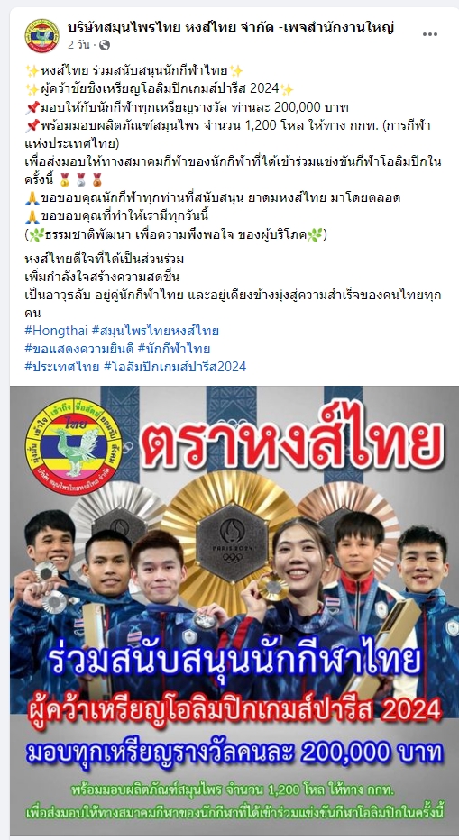 บจก.สมุนไพรหงส์ไทย ผู้ผลิตยาดมสมุนไพร ตราหงส์ไทย มอบเงินอัดฉีดให้กับนักกีฬาทุกเหรียญรางวัล เหรียญละ 200,000 บาท (รวม 1.2 ล้านบาท) พร้อมมอบผลิตภัณฑ์สมุนไพร จำนวน 1,200 โหล ให้ทางการกีฬาแห่งประเทศไทย (กกท.) เพื่อส่งมอบให้ทางสมาคมกีฬาของนักกีฬาที่ได้เข้าร่วมแข่งขันกีฬาโอลิมปิก 2024