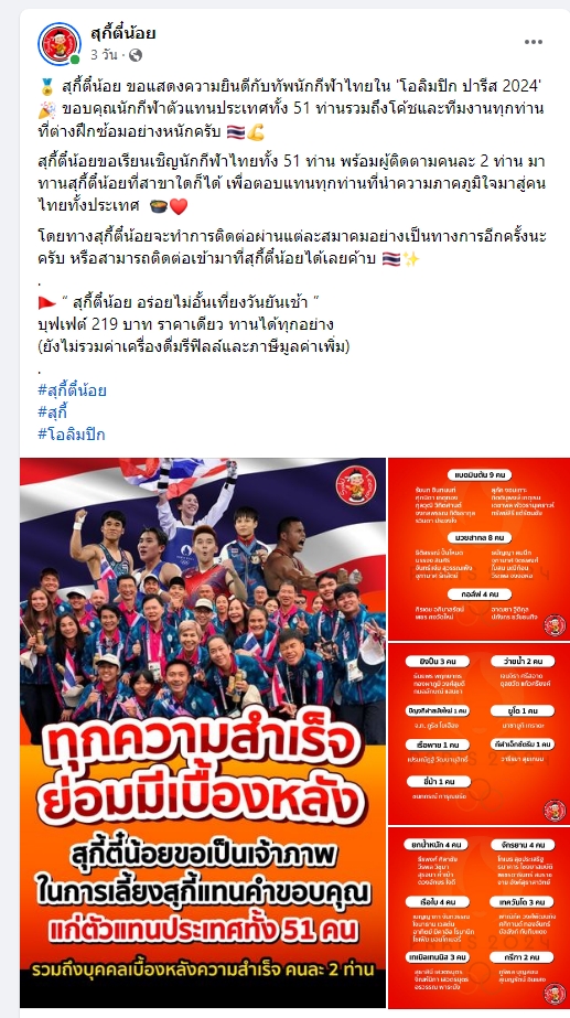 จนถึงร้านอาหารแบรนด์ดังอย่างบอนชอน ไก่ทอดสไตล์เกาหลีของเครือไมเนอร์ ให้นักกีฬาที่คว้าเหรียญโอลิมปิก 2024 ทุกคน กินไก่ทอดฟรี 1 ปีเต็ม ทั้ง 120 ทั่วประเทศ ยกเว้นสาขาในท่าอากาศยาน หรือ สุกี้ตี๋น้อย และ บาร์บีคิวพลาซ่า ที่เชิญนักกีฬาไทยทั้ง 51 คนที่สู้ศึกโอลิมปิก 2024 รับประทานมื้อบุฟเฟ่ต์ฟรี พร้อมผู้ติดตามคนละ 2 ท่าน ที่ทุกสาขาของแต่ละแบรนด์