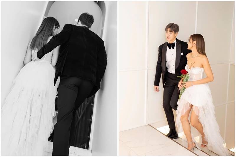 ล่าสุดเหมือนแอบไปถ่ายพรีเวดดิ้ง? ปุ๊กลุก : “ไม่ใช่ คือฉันเหมือนซื้อชุดนี้มานานแล้วไม่ได้ใส่ถ่ายสักที ปกติชุดขาวเราซื้อเสร็จปุ๊บก็จะไปงานอีเว้นต์ใดๆ วันนั้นบอกเขาว่าเธอใส่สีดำมานะ เราใส่สีขาว ตั้งใจเลยให้แรงสังคมมันกระทุ้งเขาให้มาขอเราสักที”