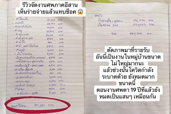 พร้อมเขียนแคปชั่นว่า "รีวิวรายจ่ายงานศพภาคอีสาน อันนี้คือรายจ่ายที่จด ๆ ไว้ตอนงานศพของคุณยาย ช่วงวันที่ 23-27 สิงหาคม 2564 ท่านเสียตี 2 วันที่ 23 แล้วงานก็เริ่มเดินตั้งแต่ตอนนั้น กับข้าวต้องทำทุกเช้า เผื่อแขก วันที่ 26 วันฌาปนกิจ วันที่ 27 ตักบาตรเช้า นับถือใจเจ้าภาพมาก อยากรู้เหมือนกันนะ ใครเป็นคนคิดริเริ่มงานศพที่มีค่าใช้จ่ายเยอะขนาดนี้"