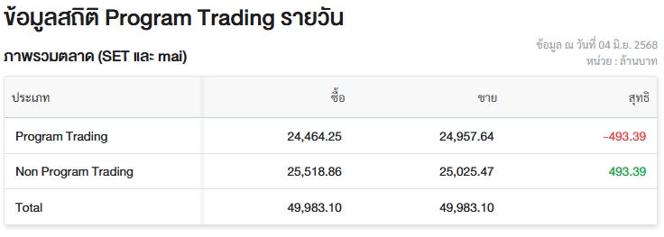 อัพเดต 04 มิ.ย. 2568 เวลา 13.22 น. • เผยแพร่ 04 มิ.ย. 2568 เวลา 13.22 น. • ข่าวหุ้นธุรกิจออนไลน์ผู้สื่อข่าวรายงานว่า วันนี้ (4 มิ.ย.68) ตลาดหลักทรัพย์แห่งประเทศไทย (ตลท.) เปิดเผยข้อมูลซื้อขายรายวันผ่าน Program Trading หรือ “โปรแกรมโรบอทเทรดดิ้ง” มีมูลค่าซื้อจำนวน 24,464.25 ล้านบาท และมูลค่าขายจำนวน 24,957.64 ล้านบาท เท่ากับขายสุทธิ 493.39 ล้านบาท