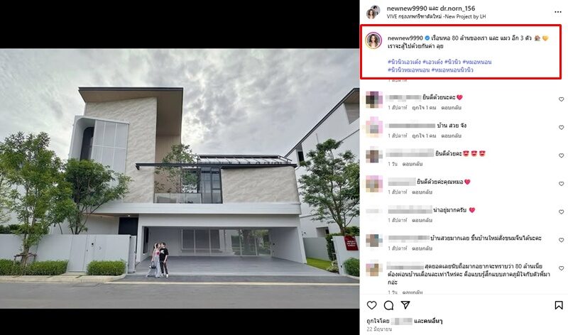 โดย นิวนิว ยังได้โพสต์ภาพของทั้งคู่ยืนอยู่หน้าบ้าน พร้อมแคปชั่นว่า “เรือนหอ 80 ล้านของเรา และ แมว อีก 3 ตัว เราจะสู้ไปด้วยกันค่า ลุย” โดยมีคอมเมนต์เข้ามาร่วมยินดีและชื่นชมบ้านสวยมากๆด้วย