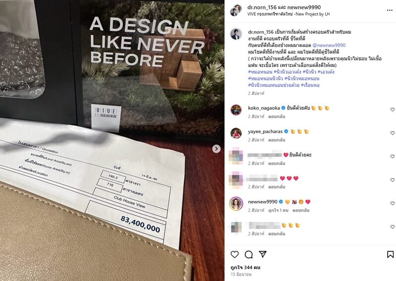 “เป็นการเริ่มต้นสร้างครอบครัวสำหรับผม งานที่ดี ครอบครัวที่ดี ชีวิตที่ดี กับคนที่ดีที่เคียงข้างผมมาตลอด @newnew9990 ผมโชคดีที่มีงานที่ดี และ ผมโชคดีที่มีคู่ชีวิตที่ดี (กว่าจะได้บ้านหลังนี้เปลี่ยนมาหลายหลังเพราะคุณนิวไม่ชอบ ไม่เชื่อแฟน จะเชื่อใคร เพราะเค้าเลือกแต่สิ่งดีให้ผม)”