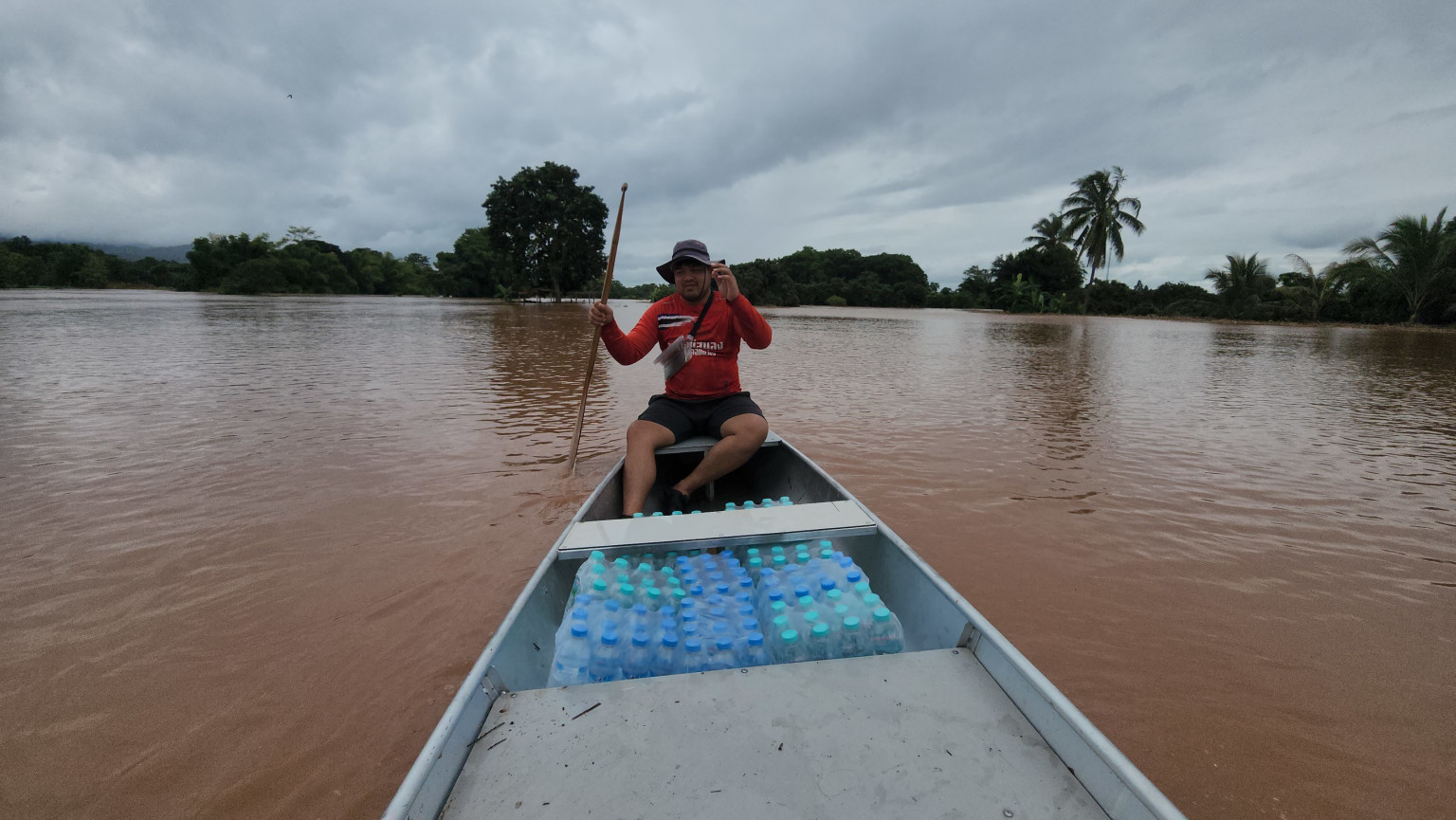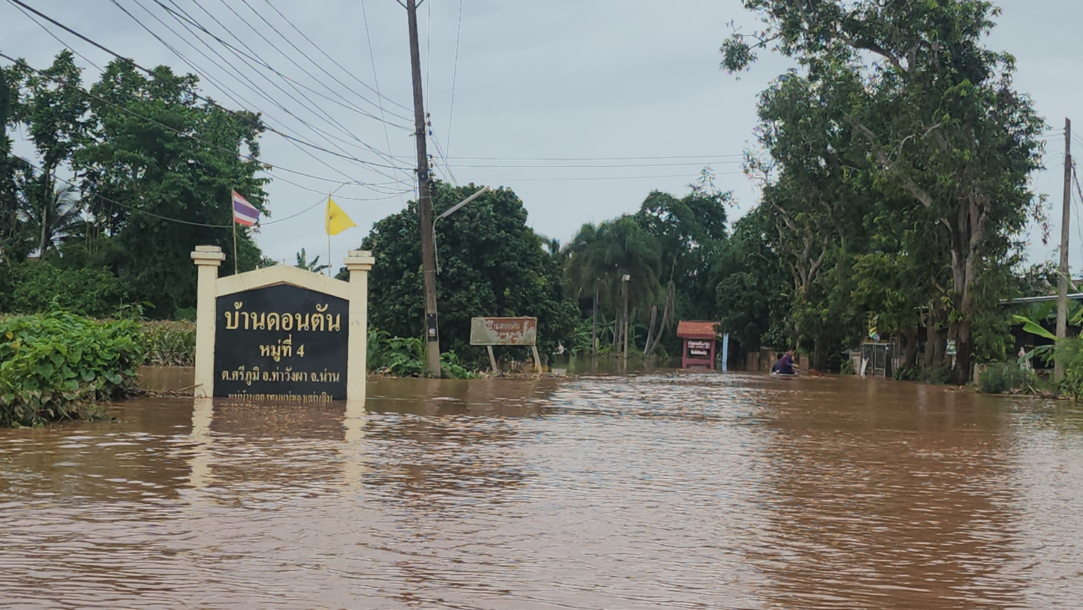 บ้านดอนตัน 100 กว่าหลังคาจมน้ำ ขณะที่เยาวชนฝีพายเรือแข่งอำเภอท่าวังผา ขนน้ำลงเรือแจกจ่ายช่วยชาวบ้าน