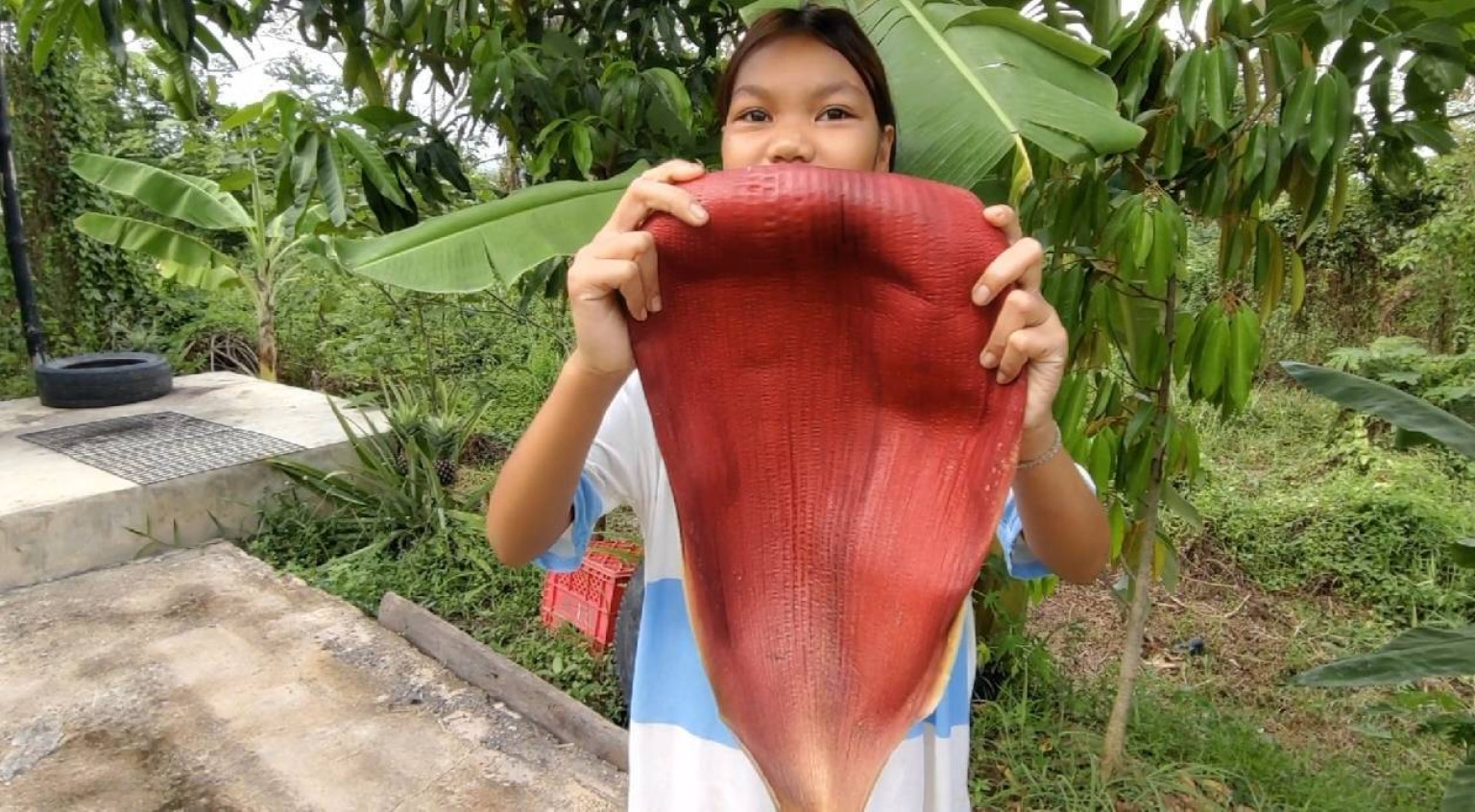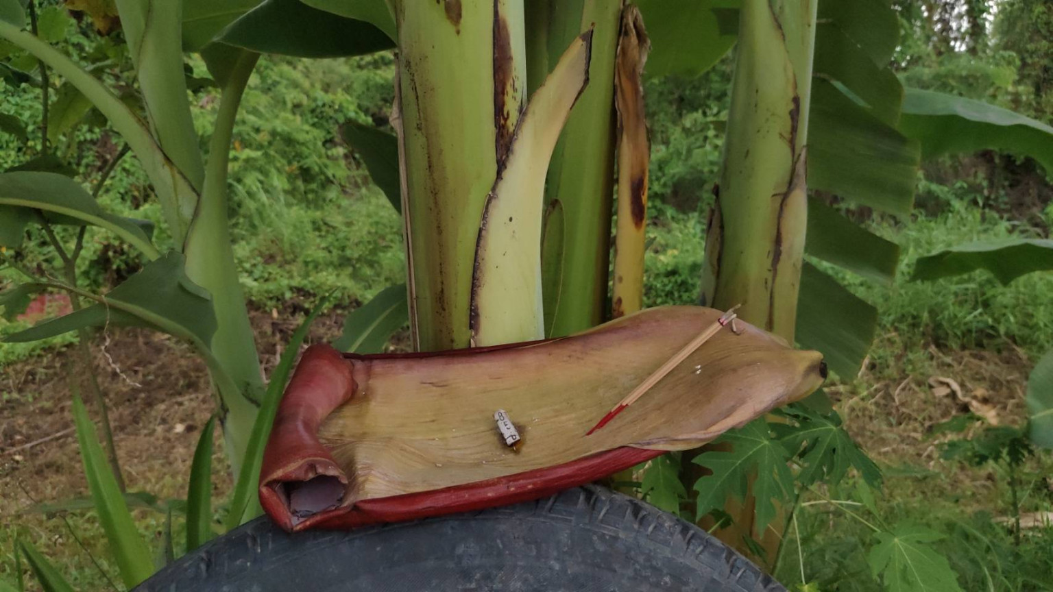 จากการสอบถามนางสาวสุพัตรา โสภา อายุ 35 ปี คนปลูกต้นกล้วยเล่าให้ฟังว่าตนเองเป็นคนชอบปลูกต้นไม้ที่บ้านก็จะปลูกต้นไม้หลายชนิด ทั้งต้นทุเรียน ต้นมะนาว ต้นมะม่วง ต้นมะละกอ ต้นสัปปะรด และต้นกล้วยน้ำว้า กล้วยหอม และอีหลายอย่างในพื้นที่แค่100 ตารางวาปลูกจนไม่มีที่จะปลูกแล้ว และช่วงนี้จะมีต้นกล้วยที่กำลังออกลูกหลายต้นแต่ละต้นก็ออกลูกปรกติ ส่วนตัวไม่เคยเห็นต้นกล้วยที่ต้นใหญ่ และ ออกปลีใหญ่ขนาดนี้ เพราะว่าที่บ้านปลูกต้นไม้ติดๆกันความจริงมันก็น่าจะแย่งอาหารกันแต่ต้นกล้วยต้นนี้มันใหญ่กว่าต้นอื่นก็คงคิดว่ามันคงเป็นเพราะดินตรงนี้ดีต้นกล้วยนั้นก็เลยสวยและอวบอ๋ันอย่างที่เห็น