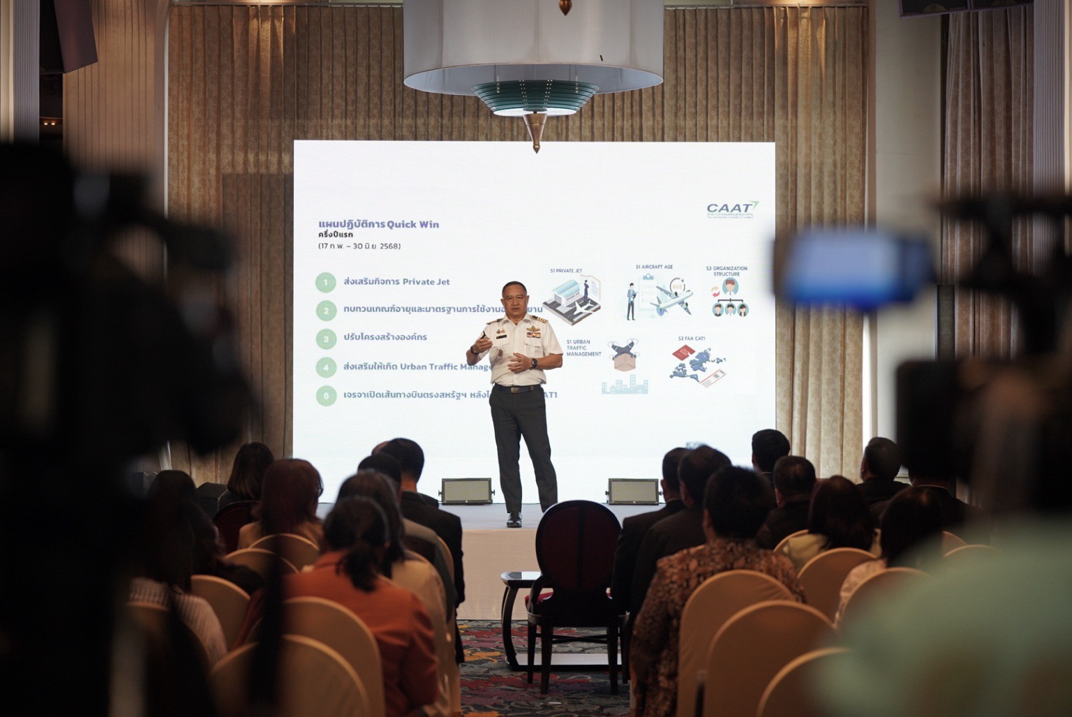 ด้านการส่งเสริมอุตสาหกรรมการบิน CAAT ได้จัดทำแผนปฏิบัติการเร่งด่วน (Quick Win Action Plan) ขับเคลื่อนใน 2 ช่วงหลัก ได้แก่: ช่วงครึ่งปีแรก (ม.ค. – มิ.ย.) มุ่งส่งเสริมธุรกิจเครื่องบินส่วนบุคคล (Private Jet) ทบทวนเกณฑ์อายุและมาตรฐานการใช้งานอากาศยาน ส่งเสริมให้เกิด Urban Traffic Management (UTM) รวมทั้งส่งเสริมการเจรจาเพื่อเปิดเส้นทางบินตรงสู่สหรัฐอเมริกา ภายหลังไทยได้รับคืนสถานะ FAA CAT1 เมื่อเดือนเมษายนที่ผ่านมา ช่วงครึ่งปีหลัง (ก.ค. – ธ.ค.) มุ่งพัฒนาโครงสร้างพื้นฐานการบิน เพื่อส่งเสริมให้ไทยเป็นศูนย์กลางการบินภูมิภาค ส่งเสริมและสนับสนุนศูนย์ซ่อมบำรุงอากาศยาน (MRO) ที่สุวรรณภูมิ ดอนเมือง และภูเก็ต พร้อมยกระดับกระบวนการอนุญาตด้วยเทคโนโลยี เช่น ระบบ Fast Track และส่งเสริมการให้บริการเครื่องบินน้ำ หรือ Sea Plane รวมถึงการจัดตั้งสนามบินน้ำ (Water Aerodromes)