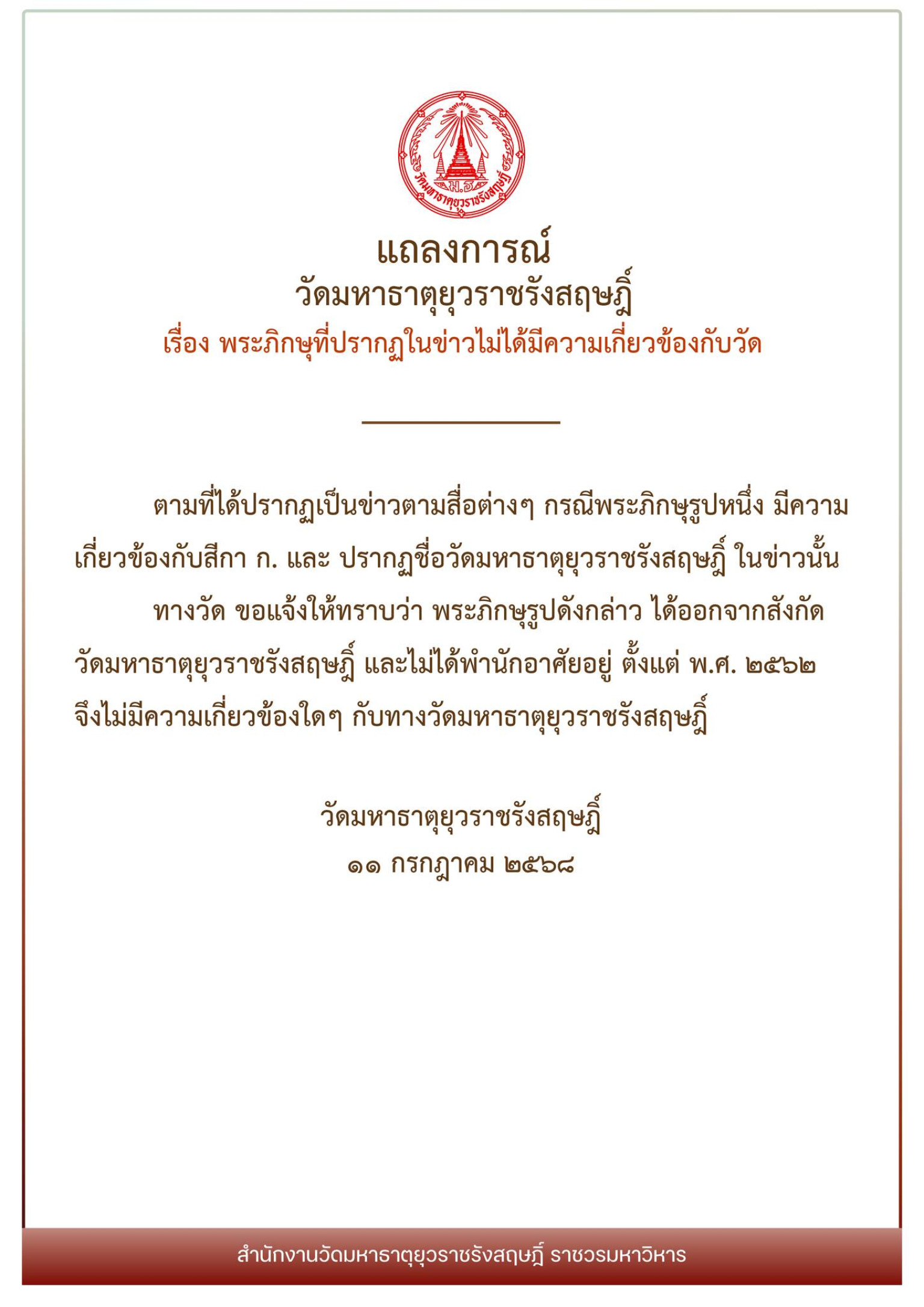 ตามที่ได้ปรากฏเป็นข่าวตามสื่อต่างๆ กรณีพระภิกษุรูปหนึ่งมีความเกี่ยวข้องกับสีกา ก. และปรากฏชื่อวัดมหาธาตุยุวราชรังสฤษฎิ์ ในข่าวนั้นทางวัดขอแจ้งให้ทราบว่า พระภิกษุรูปดังกล่าว ได้ออกจากสังกัดวัดมหาธาตุยุวราชรังสฤษฎิ์ และไม่ได้พํานักอาศัยอยู่ ตั้งแต่ พ.ศ. 2562 จึงไม่มีความเกี่ยวข้องใดๆ กับทางวัดมหาธาตุยุวราชรังสฤษฎิ์