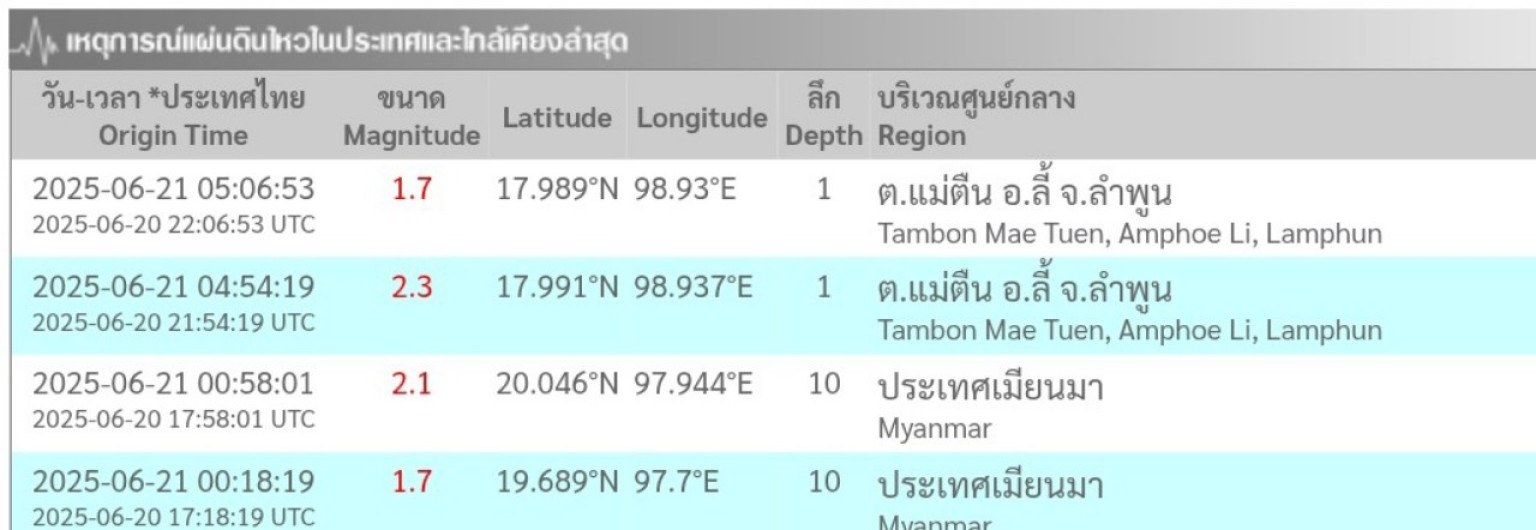 วันที่ 21 มิ.ย.68-รายงานข่าวจากกองเฝ้าระวังแผ่นดินไหว กรมอุตุนิยมวิทยา แจ้งว่า ช่วงเวลา 00.00น.เข้าสู่เริ่มต้นวันใหม่ตามเวลาของไทยจนถึง06.00น.ได้เกิดแผ่นดินไหวรวม 4ครั้งด้วยกัน ขนาดความรุนแรงริกเตอร์ไม่มาก ในจำนวนนี้เกิดในประเทศเมียนมา2ครั้ง และเกิดฝั่งไทยที่จังหวัดลำพูนในเวลาไล่เลี่ยกัน ห่างกันไม่มากถึง2ครั้งได้แก่เวลา04.54น.เกิดแผ่นดินไหว 2.3ริกเตอร์ ขนาดความลึก 1กม.ที่ต.แม่ตืน อ.ลี้ จ.ลำพูน ถัดมาเวลา05.06น.เกิดแผ่นดินไหวตามมาขนาดความรุนแรง 1.7ริกเตอร์ ขนาความลึก 1กม.ที่อ.แม่ตืน อ.ลี้ จ.ลำพูน
