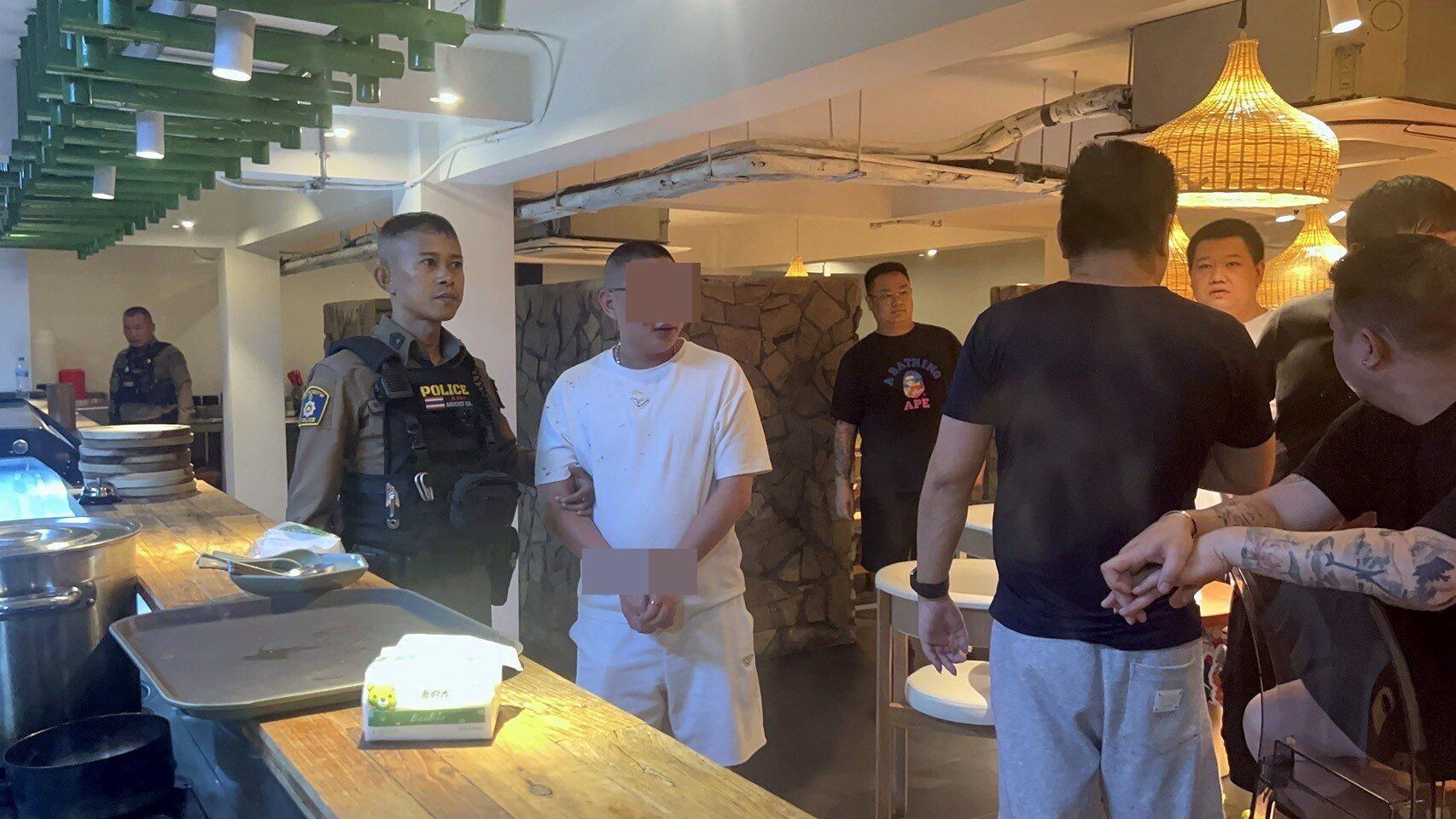 ที่เกิดเหตุพบ นายเชง อายุ 40 ปี สัญชาติจีน ได้รับบาดเจ็บ ถูกของมีคมแทงเข้าที่ชายโครงซ้าย เจ้าหน้าที่กู้ภัยฯ ให้การช่วยเหลือก่อนเคลื่อนย้ายส่งโรงพยาบาลอย่างเร่งด่วน ขณะที่หน้าร้านที่เกิดเหตุมีกลุ่มเพื่อนของผู้บาดเจ็บ ช่วยกันจับกุมตัวผู้ก่อเหตุได้ คือ นายเวน เควง สัญชาติจีนสัญชาติจีน พร้อมมีดปลอกผลไม้หนึ่งเล่ม จึงเก็บไว้เป็นหลักฐาน ตรวจสอบภายในที่เกิดเหตุบนชั้น 5 ห้องอาหาร วี 6 พบร่องรอยการต่อสู้ มีคราบเลือดตามพื้นและพนังห้อง