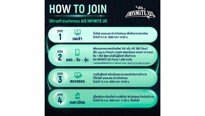 พิเศษ! สำหรับลูกค้าเอไอเอส ที่ใช้เอไอเอส พอยท์แลกสิทธิ์ในกิจกรรม AIS INFINITE US ช่วงเวลาตั้งแต่วันที่ 9 ก.พ. 2569 ถึง 10 ก.พ. 2569 สามารถรับชมการแสดงผ่าน LIVE STREAMING ที่ AIS PLAY ได้ทุกคน!