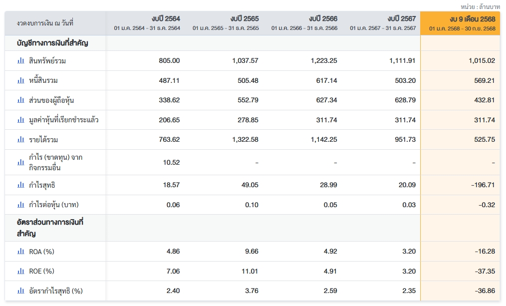 - 9 เดือนแรก ปี 2568 : รายได้รวม 525.75 ล้านบาท ขาดทุนสุทธิ 196.71 ล้านบาท