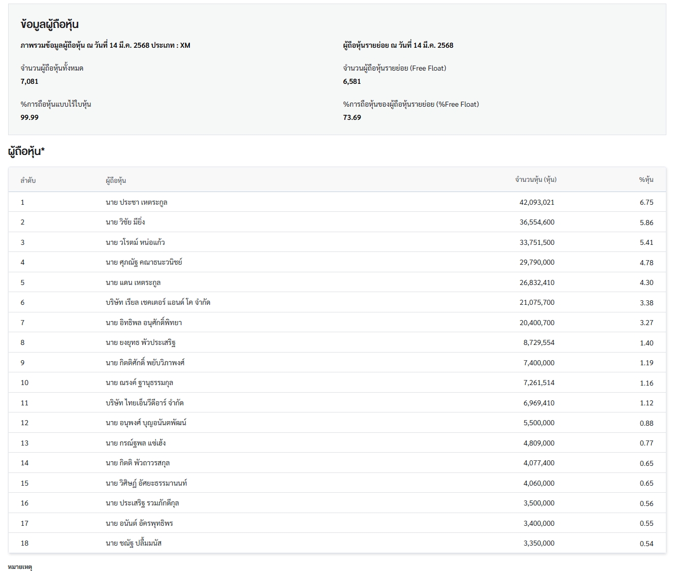 1. นายประชา เหตระกูล – 42,093,021 หุ้น (6.75%)