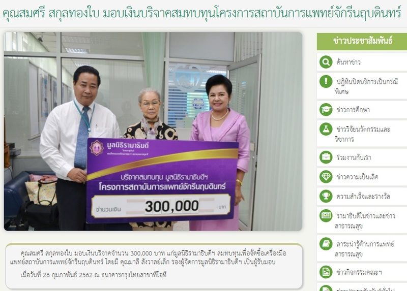 ผู้สื่อข่าวรายงานว่า จากการตรวจสอบชื่อของคุณยาย คือ น.ส.สมศรี สกุลทองใบ พบว่าเมื่อวันที่ 26 ก.พ.62 ได้เดินทางไปมอบเงินบริจาคจำนวน 3 แสนบาท ให้กับมูลนิธิรามาธิบดี สมทบทุนเพื่อจัดซื้อเครื่องมือแพทย์สถาบันการแพทย์จักรีนฤบดินทร์อีกด้วย