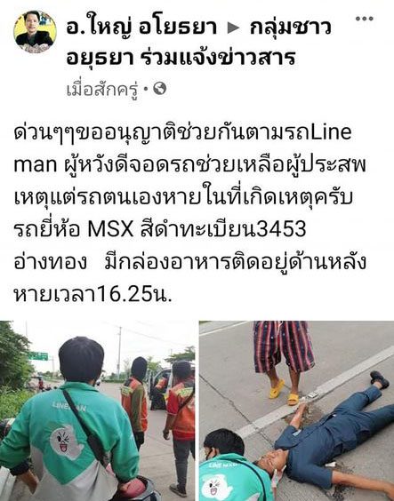 วันที่ 12 ก.ย. ผู้สื่อข่าวรายงานความคืบหน้า กรณีที่วานนี้มี หนุ่มไลน์แมน จอดช่วยคนถูกรถชน แต่โดนขโมยจยย. หลังจากที่ผู้ใช้เฟซบุ๊กชื่อ อ.ใหญ่ อโยธยา โพสต์ขอความช่วยเหลือ ระบุว่า "คนทำดีทำไมต้องเป็นแบบนี้ ขออนุญาตช่วยกันตามรถไลน์แมน เป็นผู้หวังดีจอดรถช่วยเหลือผู้ประสบเหตุแต่รถตนเองหายในที่เกิดเหตุครับ