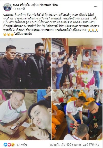 “ขอบคุณ พี่เนรมิตร สัปเหร่อไฮโซ ที่มาช่วยงานพี่โรเบริต พอเราติดต่อไปเค้าเต็มใจมาช่วยพวกเราทันที จากวันที่27 มาแต่เช้า จนเสร็จยันดึก และเช้ามาตั้งเช้า ทำพิธีเก็บกระดูก